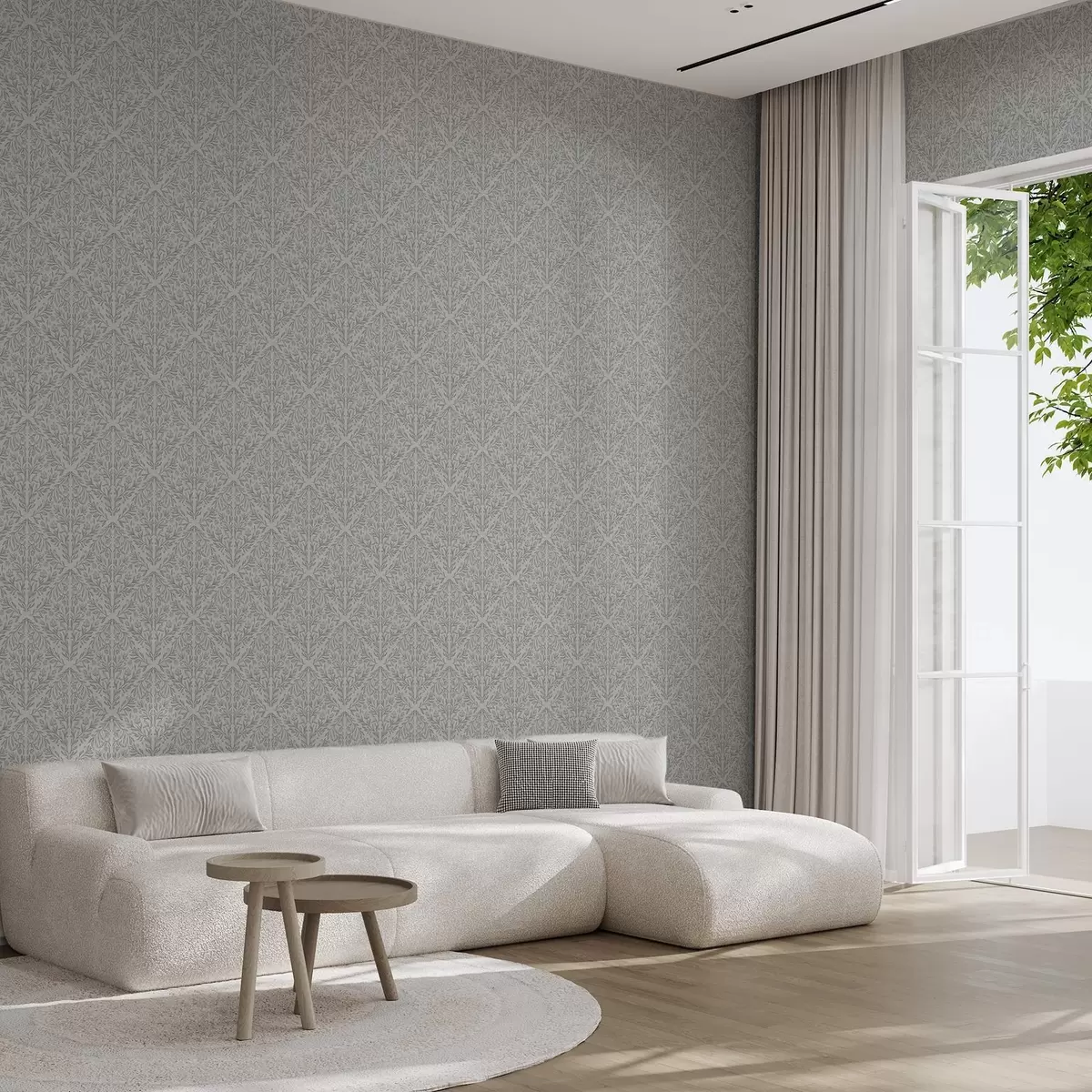 Шпалери Ботанічний дамаск світло-сірого кольору з м'якими контурами Nr. a00815v2
