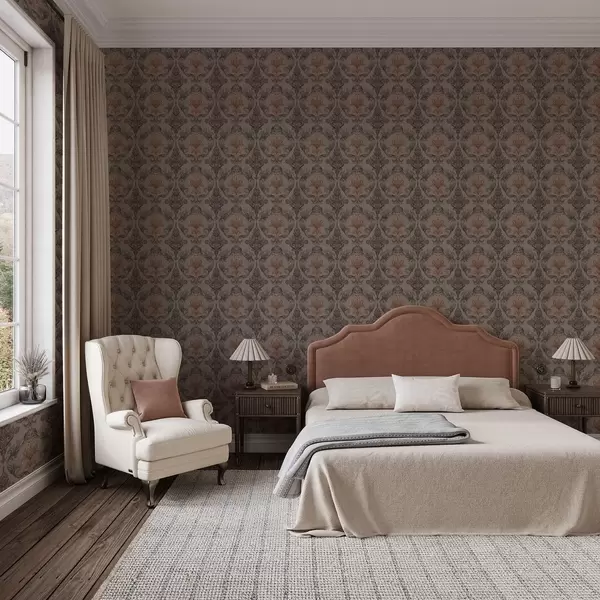 Шпалери Дамаск у коричнево-теракотовій палітрі, теплий сірий фон Nr. a00828v2