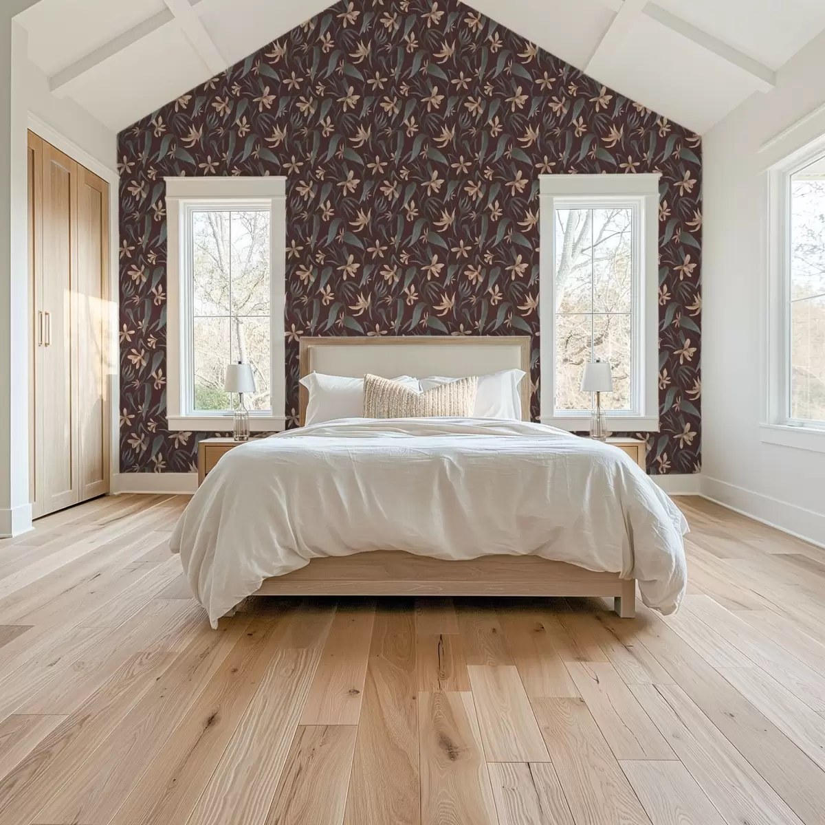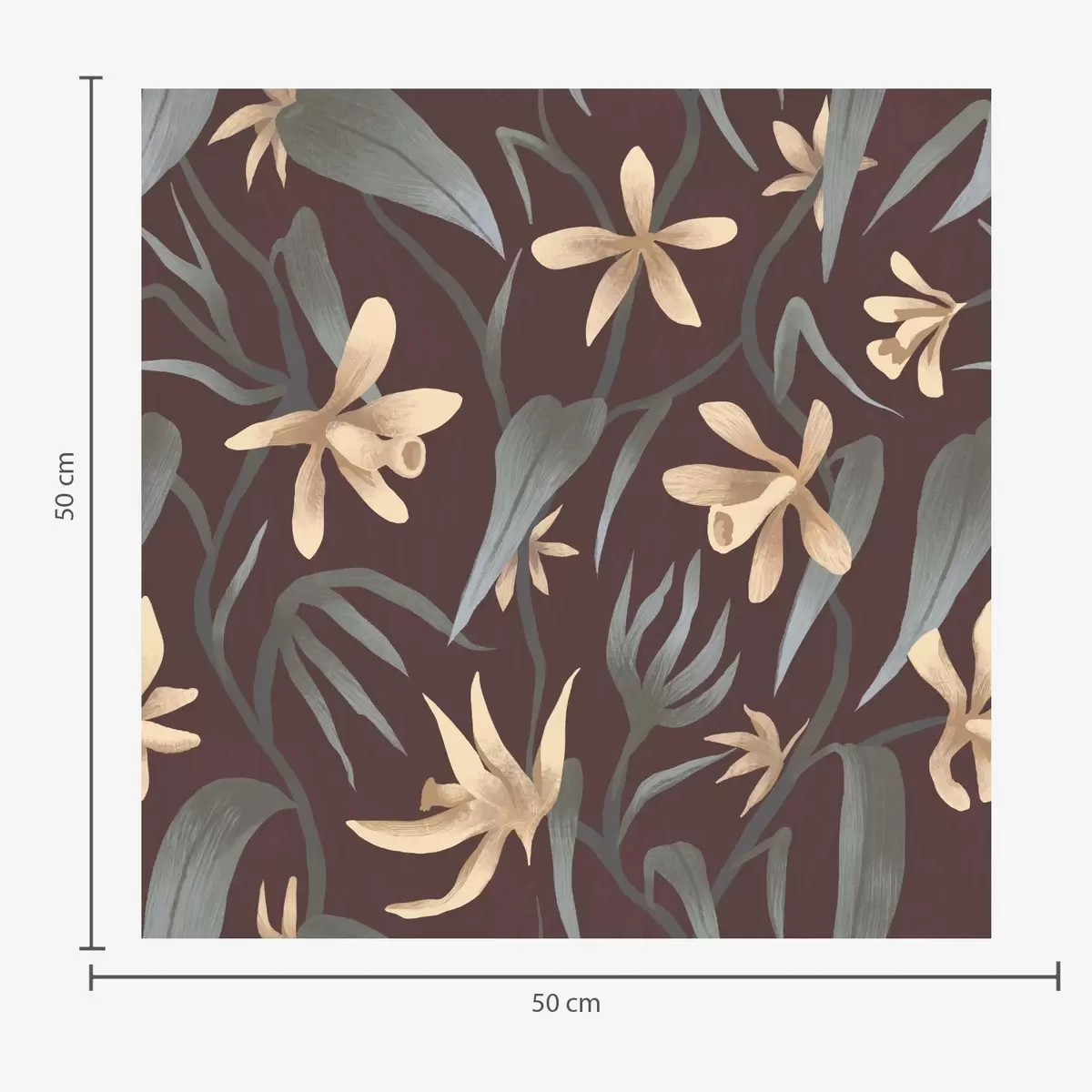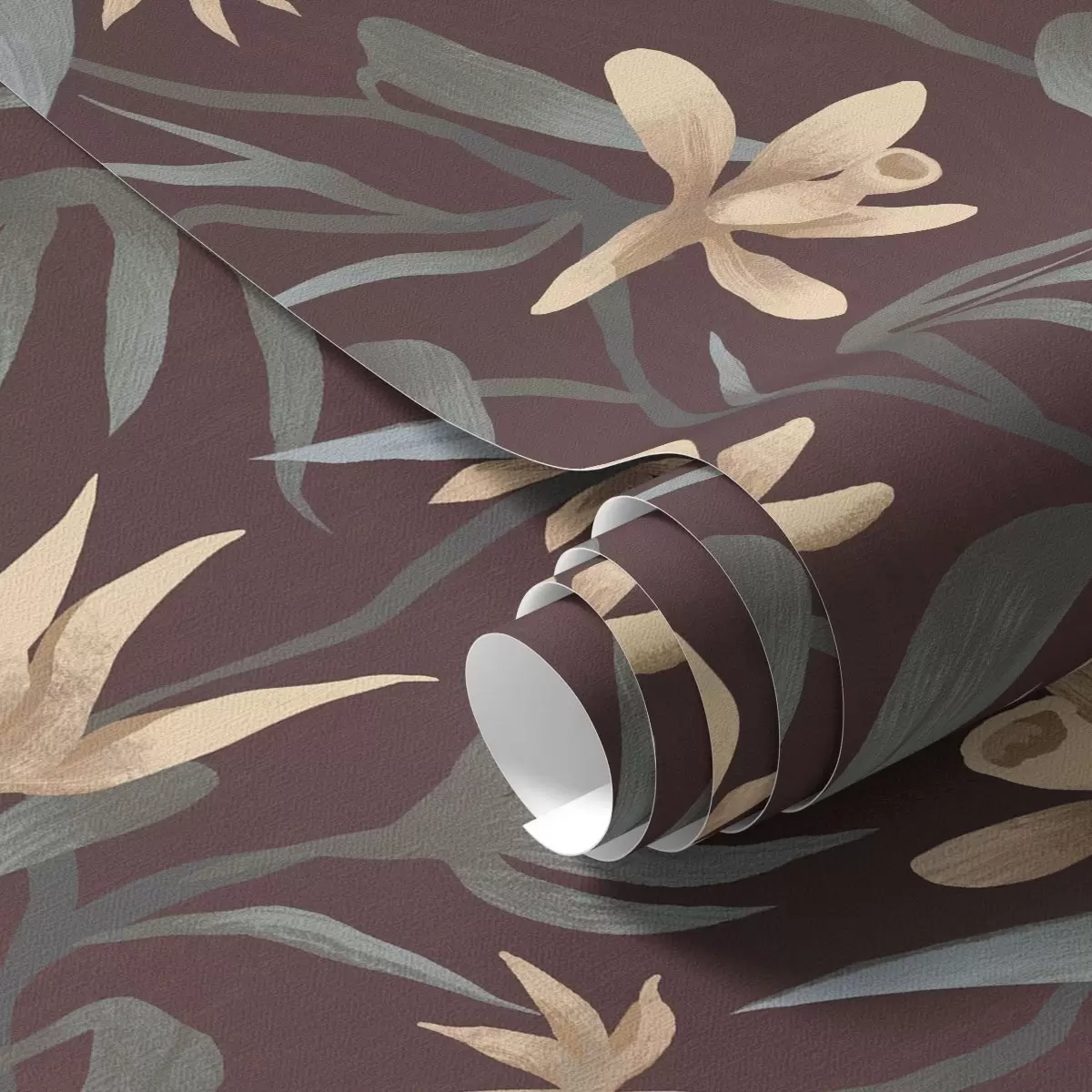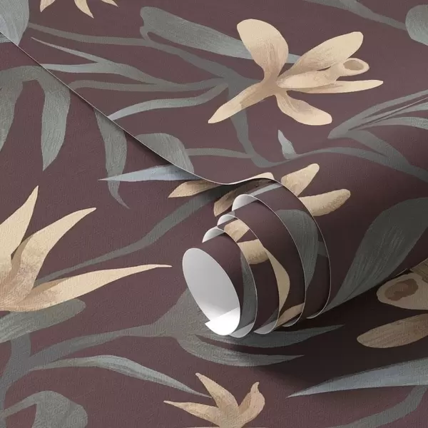 Шпалери Кремові квіти з сірими листям на бордовому тлі Nr. a00833