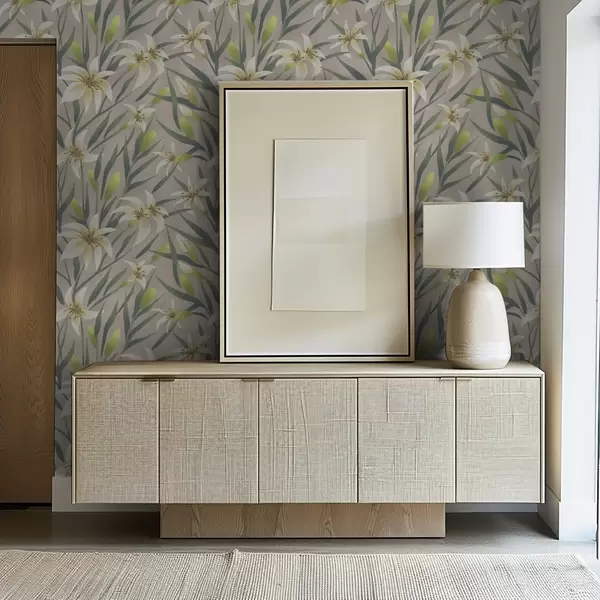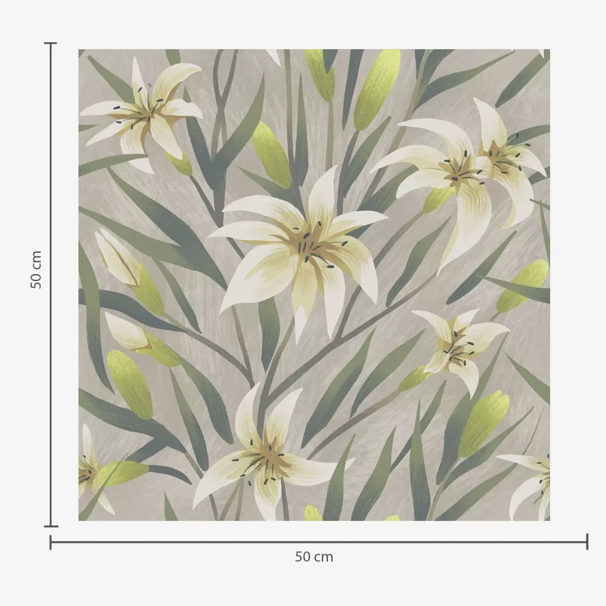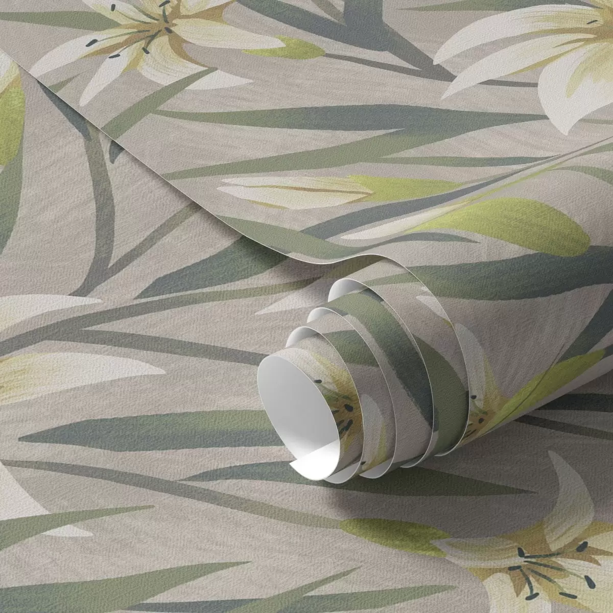 Шпалери Кремові лілії з листям на сіро-бежевому тлі Nr. a00837