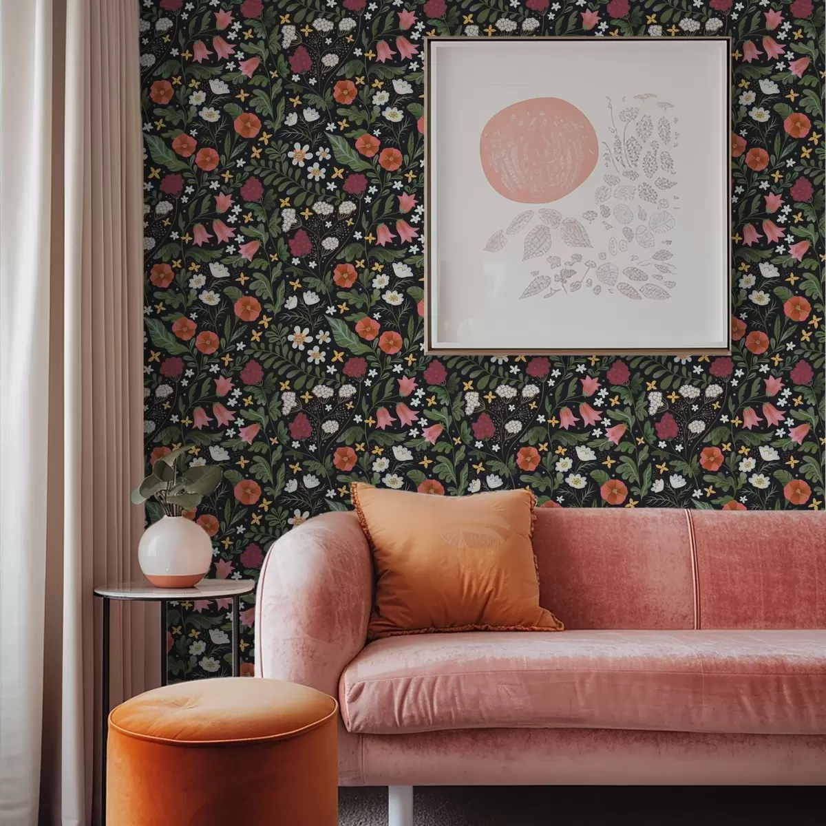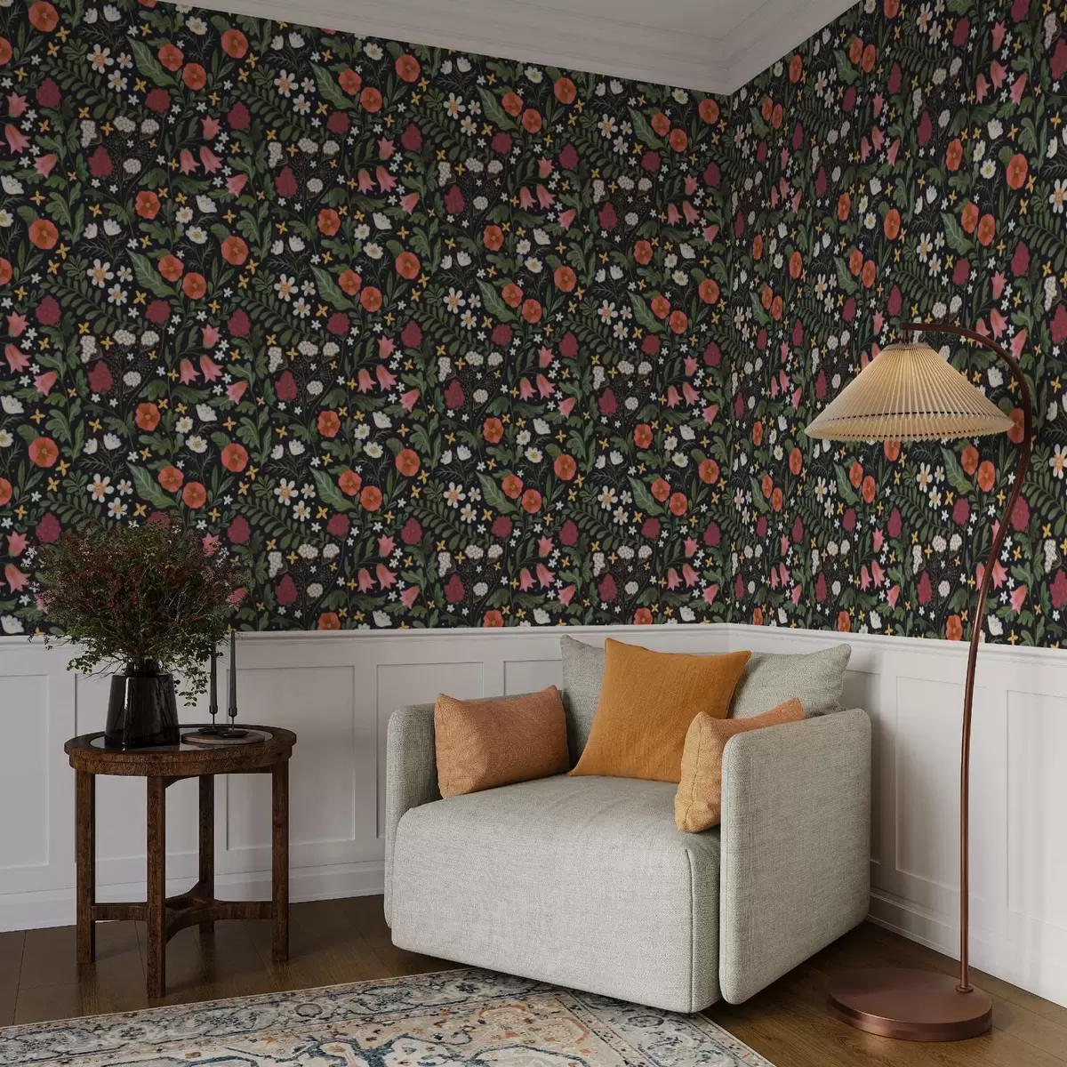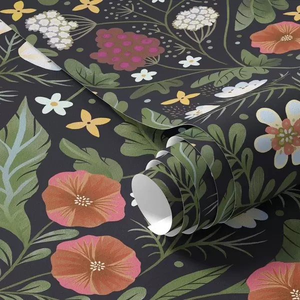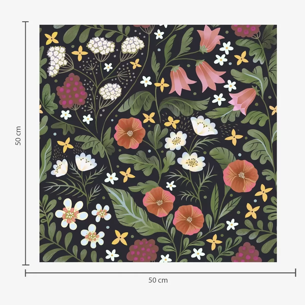 Шпалери Польові квіти та ягоди на глибокому чорному тлі Nr. a00849v3