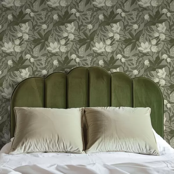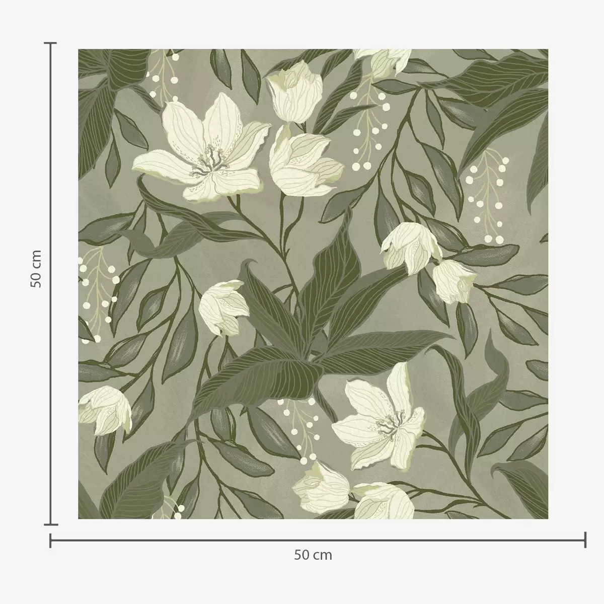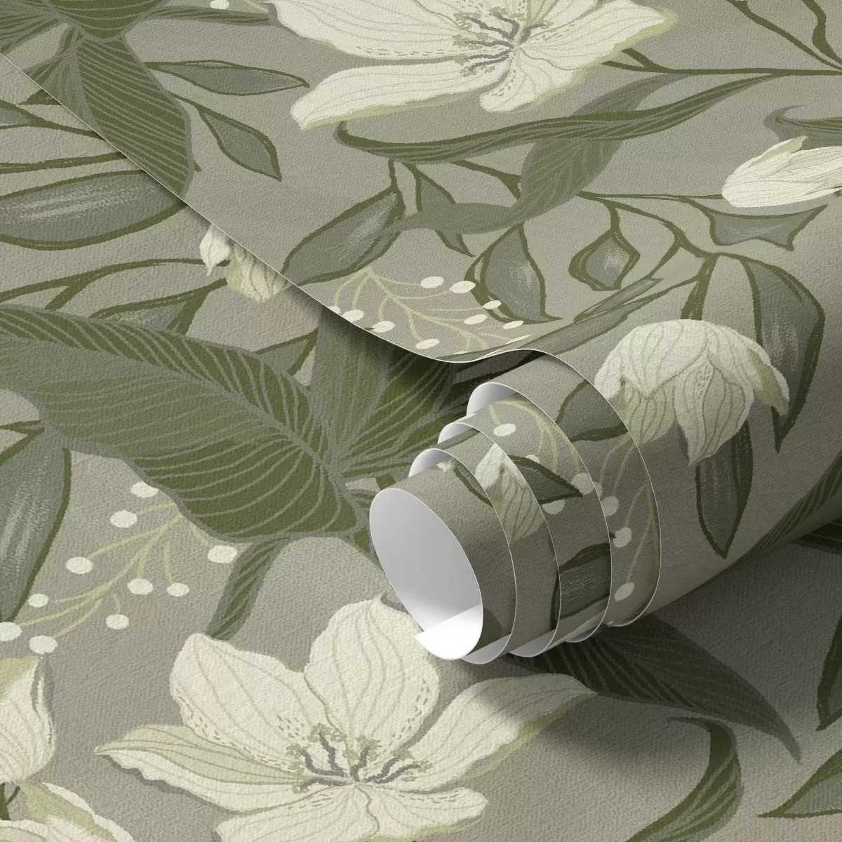 Шпалери Бліді лілії та листя на сіро-оливковому тлі Nr. a00854