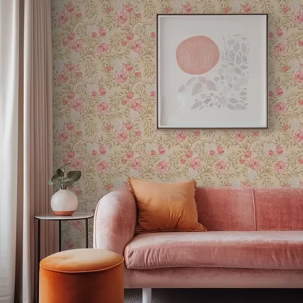 Шпалери Рожеві квіти, білі суцвіття та листя в охристому відтінку Nr. a00855