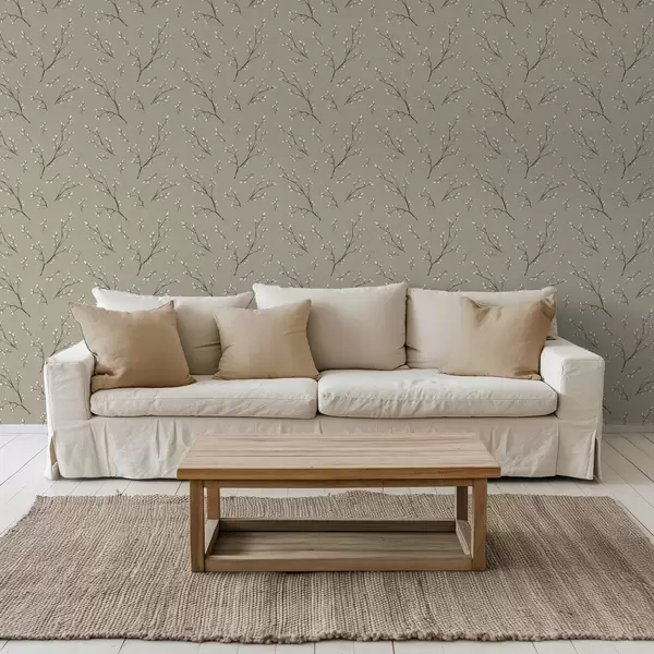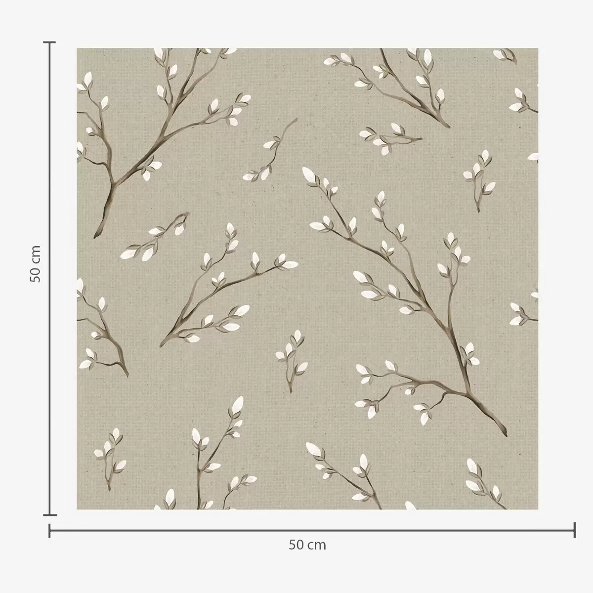 Шпалери Гілочки з білими бруньками на фоні льону кольору таупе Nr. a00861