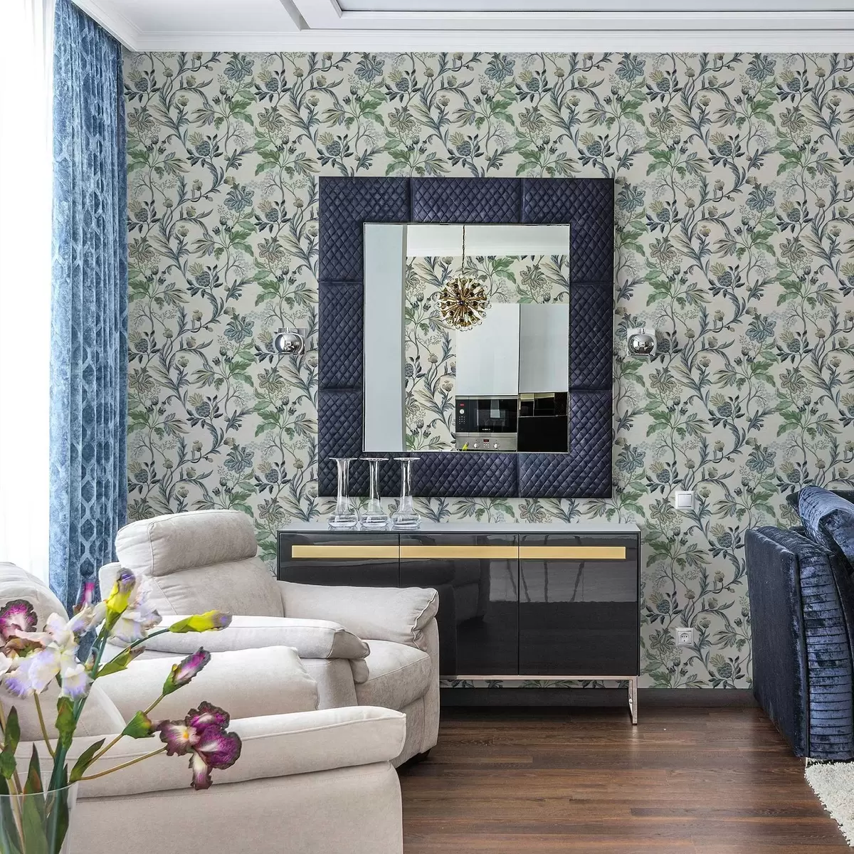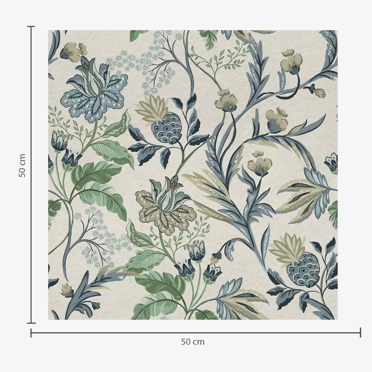Шпалери Синьо-зелені народні квіти та листя на кремовому тлі Nr. a00863