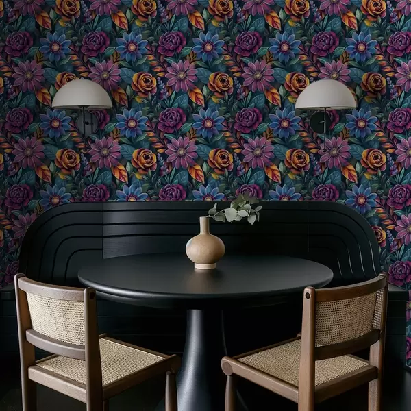 Шпалери Яскраві квіткові візерунки в кольорах дорогоцінних каменів на темно-синьому тлі Nr. a00871