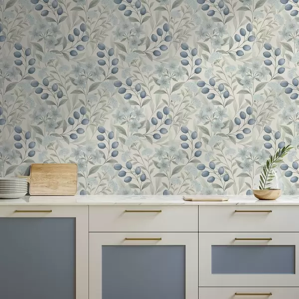 Шпалери Блакитні ягоди та світлі квіти на слоновій кістці Nr. a00872