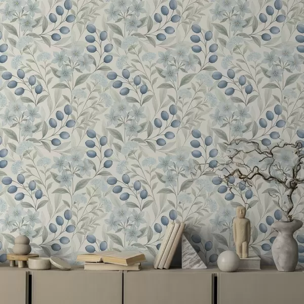 Шпалери Блакитні ягоди та світлі квіти на слоновій кістці Nr. a00872