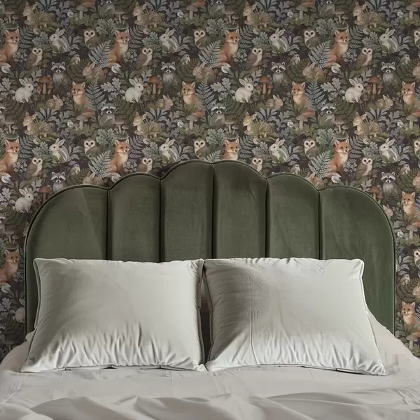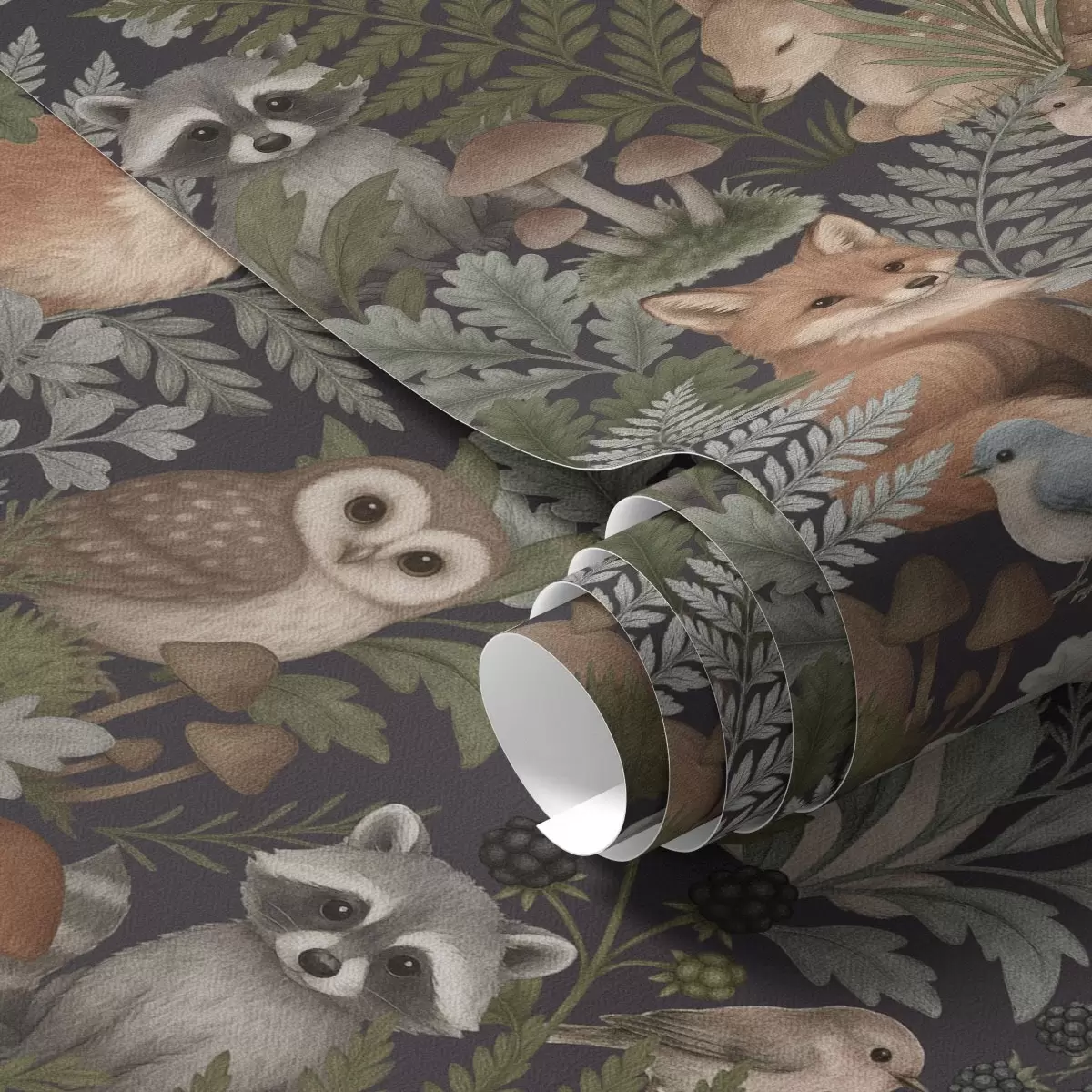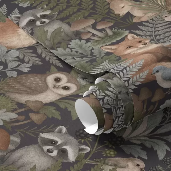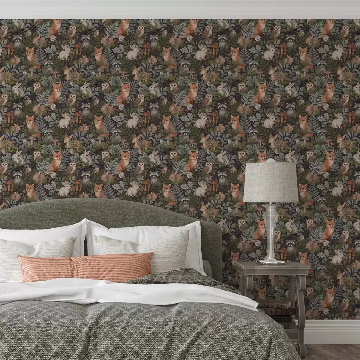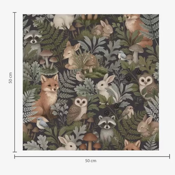Шпалери Лісові тварини та папороті на глибокому вугільному тлі Nr. a00880