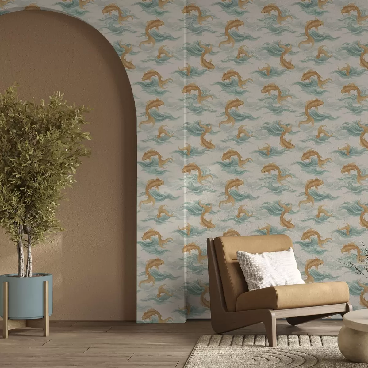 Шпалери Бурштинова риба коі, що плаває серед м'яких бірюзових хвиль Nr. a00894