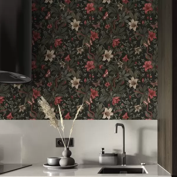 Шпалери Темні джунглі з квітами, птахами та метеликами Nr. a00895