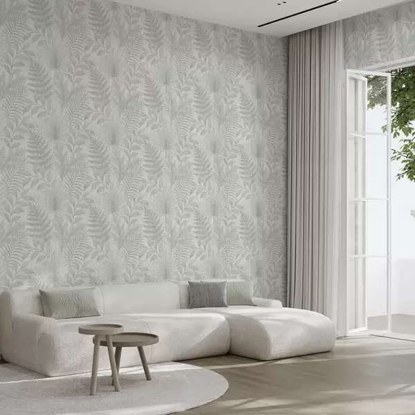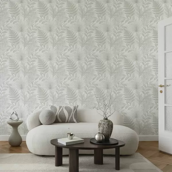 Шпалери М'які тропічні листя блідо-сірого кольору на лляній текстурі Nr. a00899