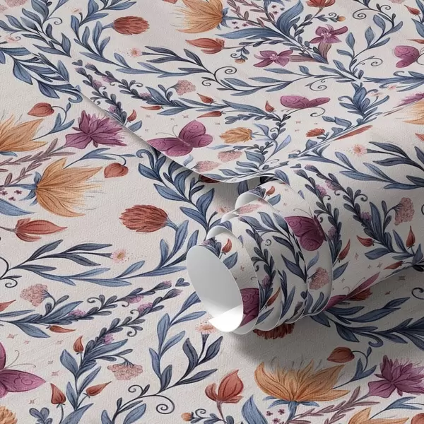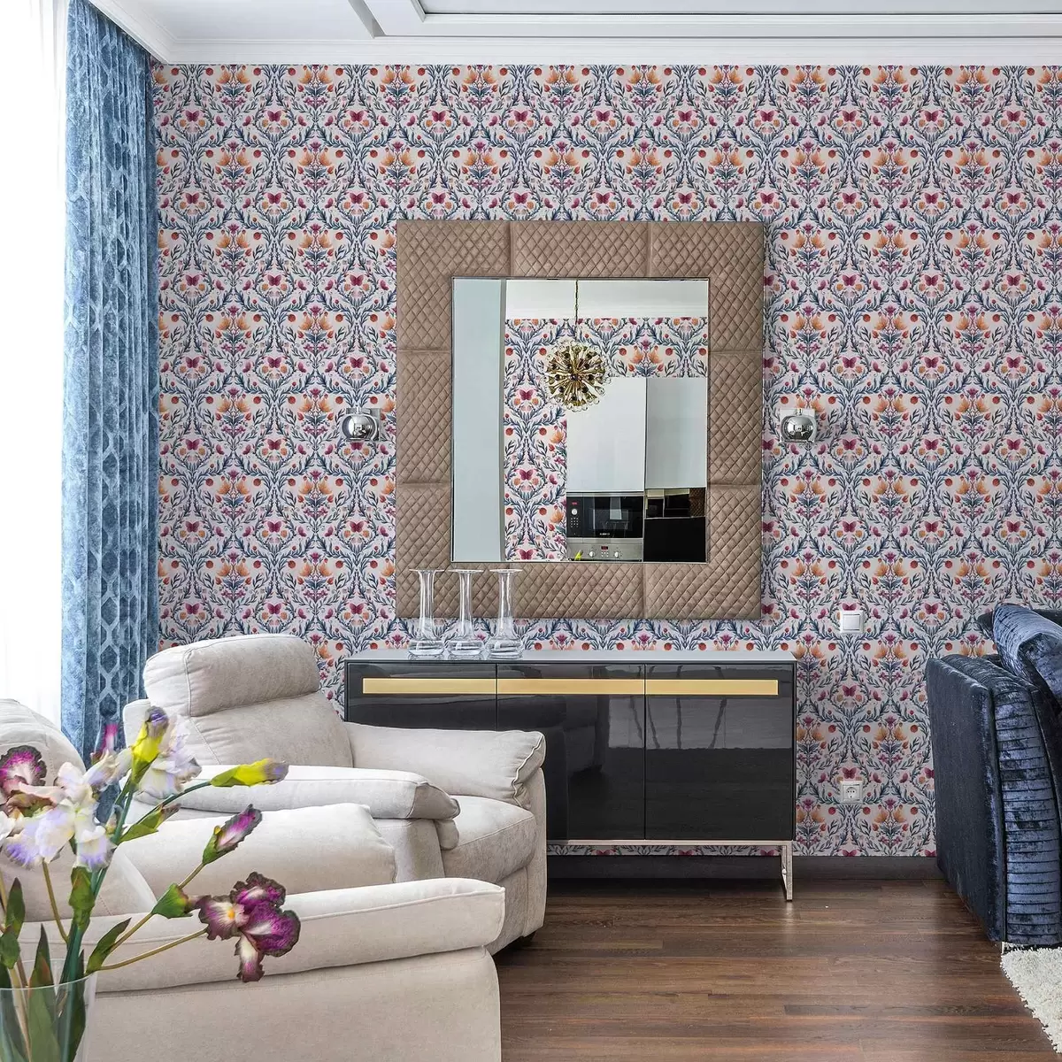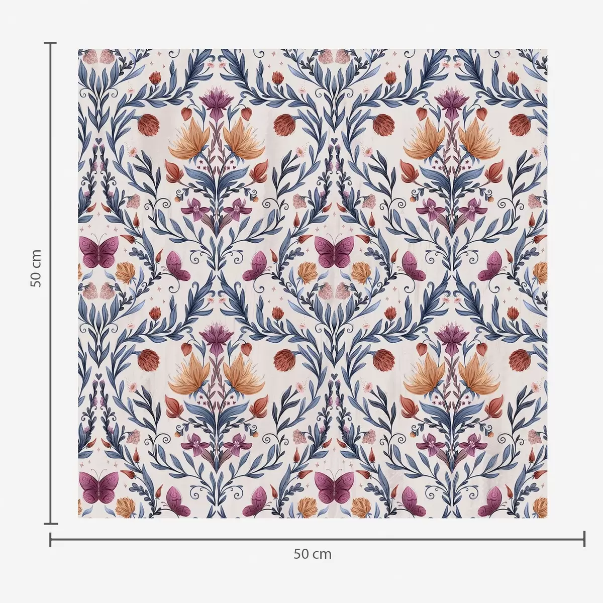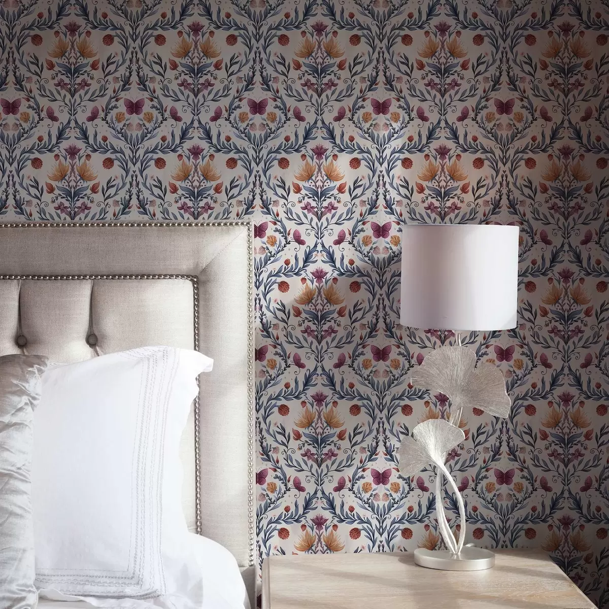 Шпалери Квітковий дамаск з метеликами в темно-синьому і теракотовому кольорах на білому тлі Nr. a00926v1
