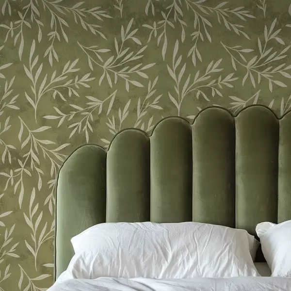 Шпалери Кремово-білі гілочки на теплому оливковому текстурованому тлі Nr. a00936v1