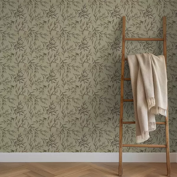 Шпалери Бузкові та зелені гілки з листям на теплому тлі Nr. a00936v4
