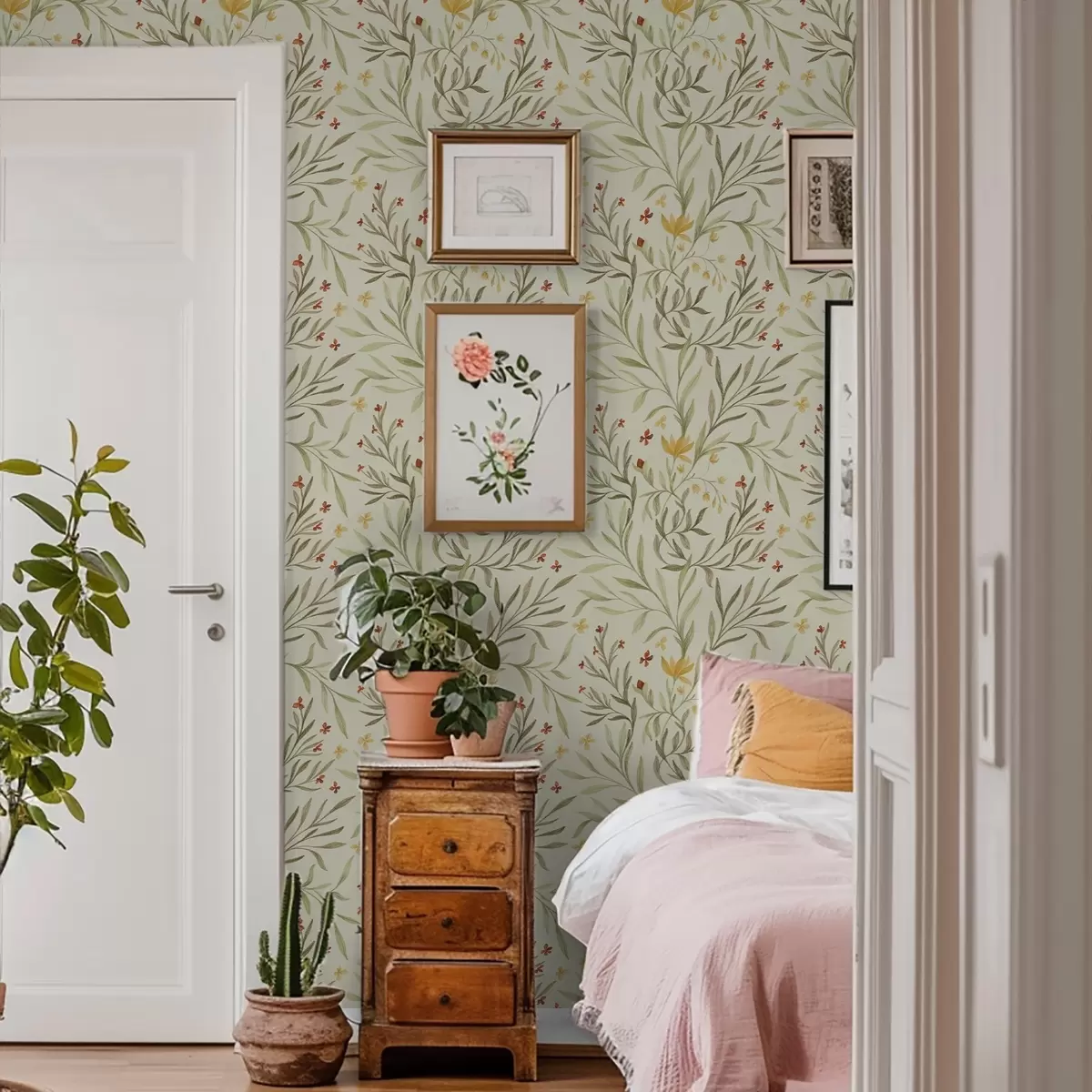 Шпалери Жовті та червоні квіти на світло-зеленому тлі Nr. a00937