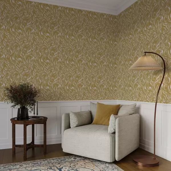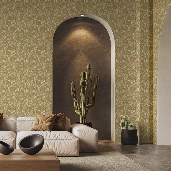 Шпалери Кремово-білий листовий орнамент на теплому охристому тлі Nr. a00940v1