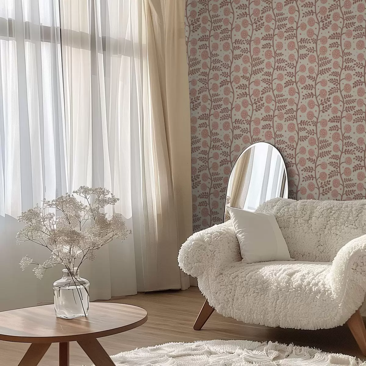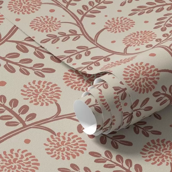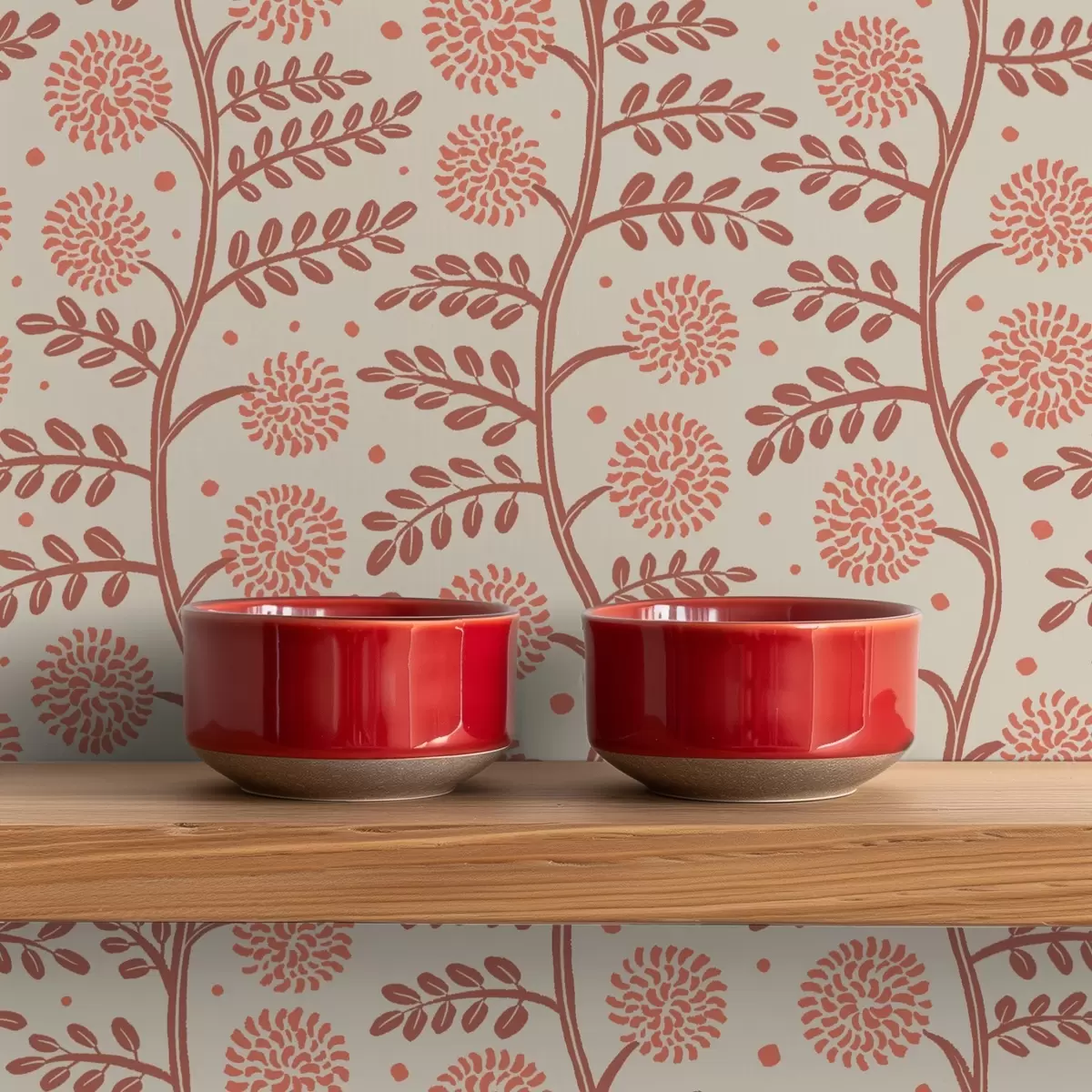 Шпалери Теракотові стебла з пухнастими кораловими квітами на кремовому тлі Nr. a00997v1