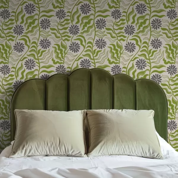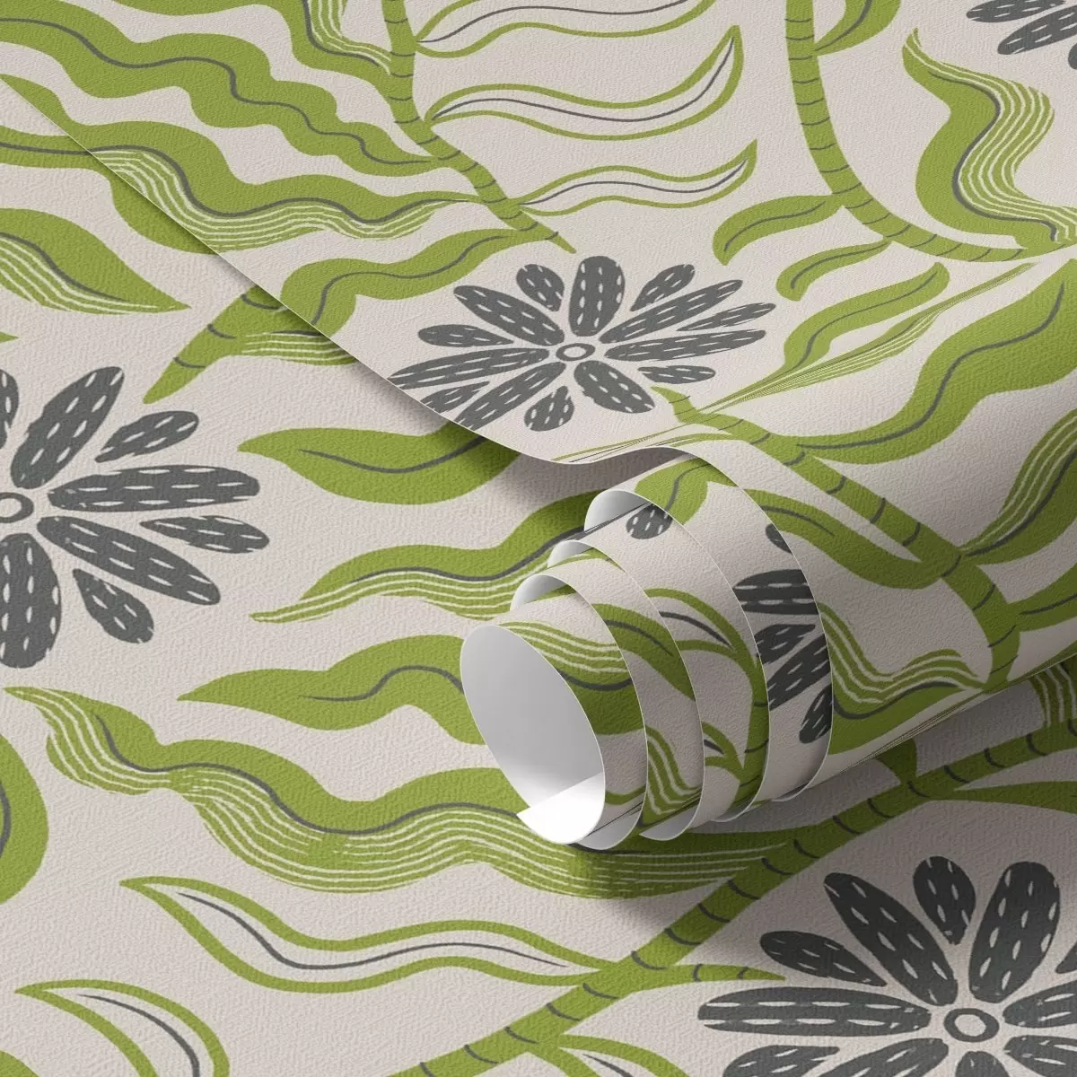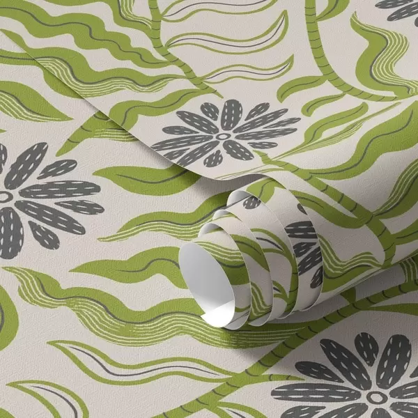 Шпалери Грайливі зелені маргаритки з хвилястими листям на кремовому тлі Nr. a00998