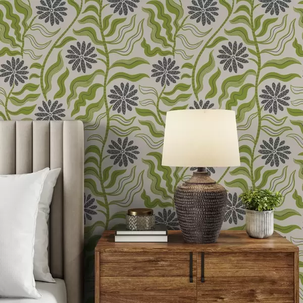 Шпалери Грайливі зелені маргаритки з хвилястими листям на кремовому тлі Nr. a00998