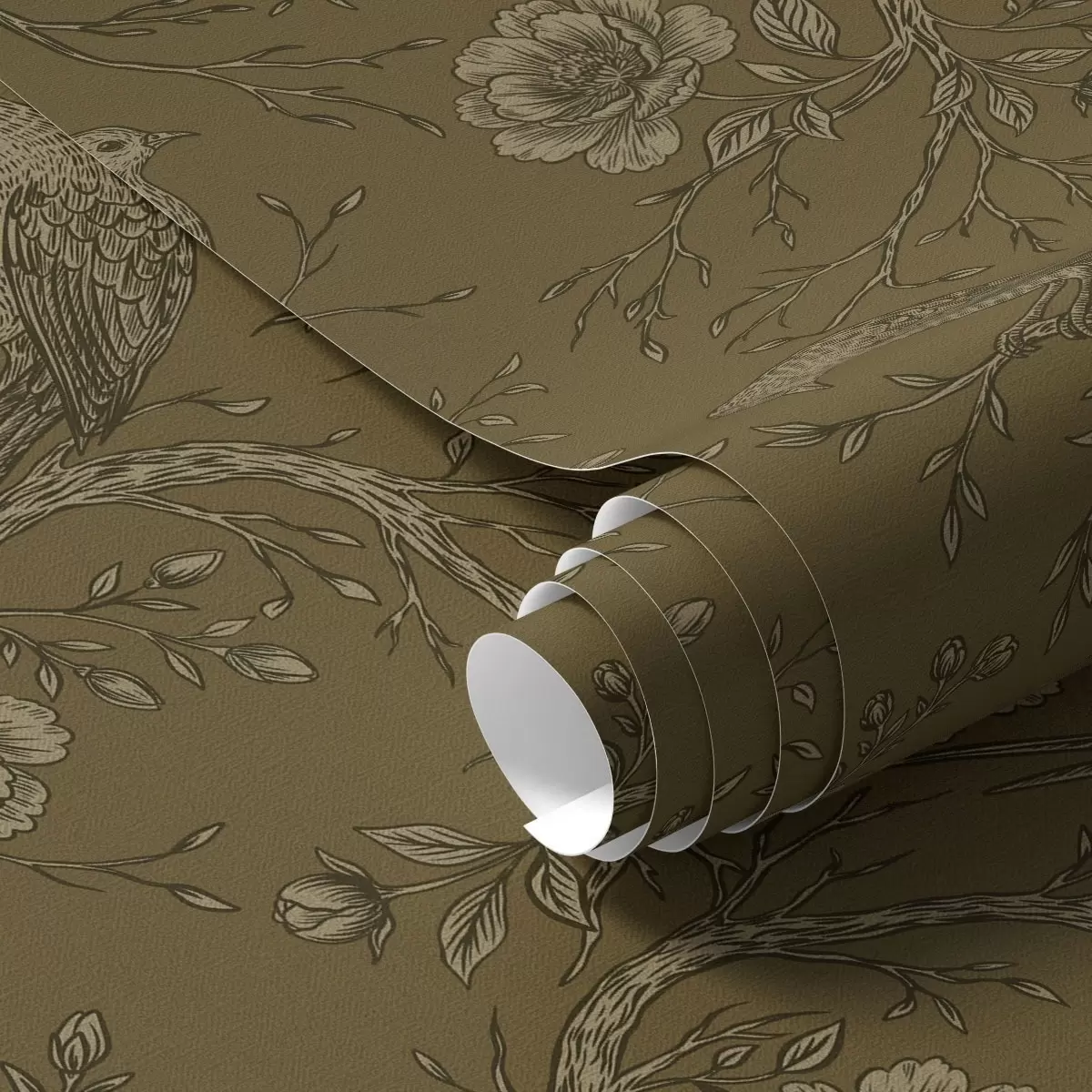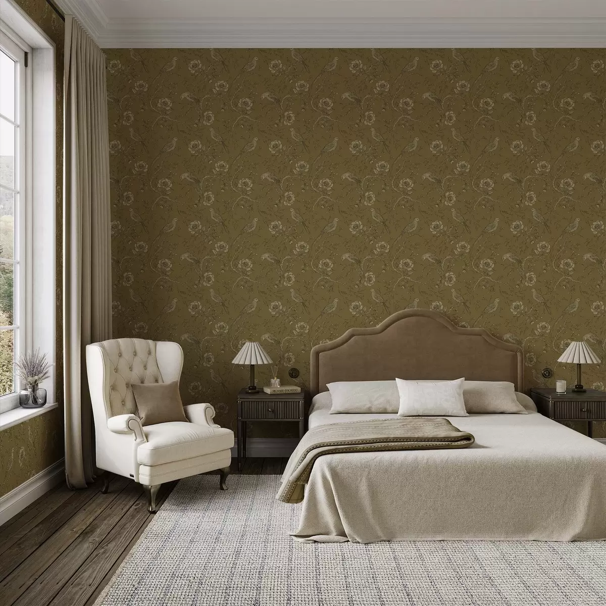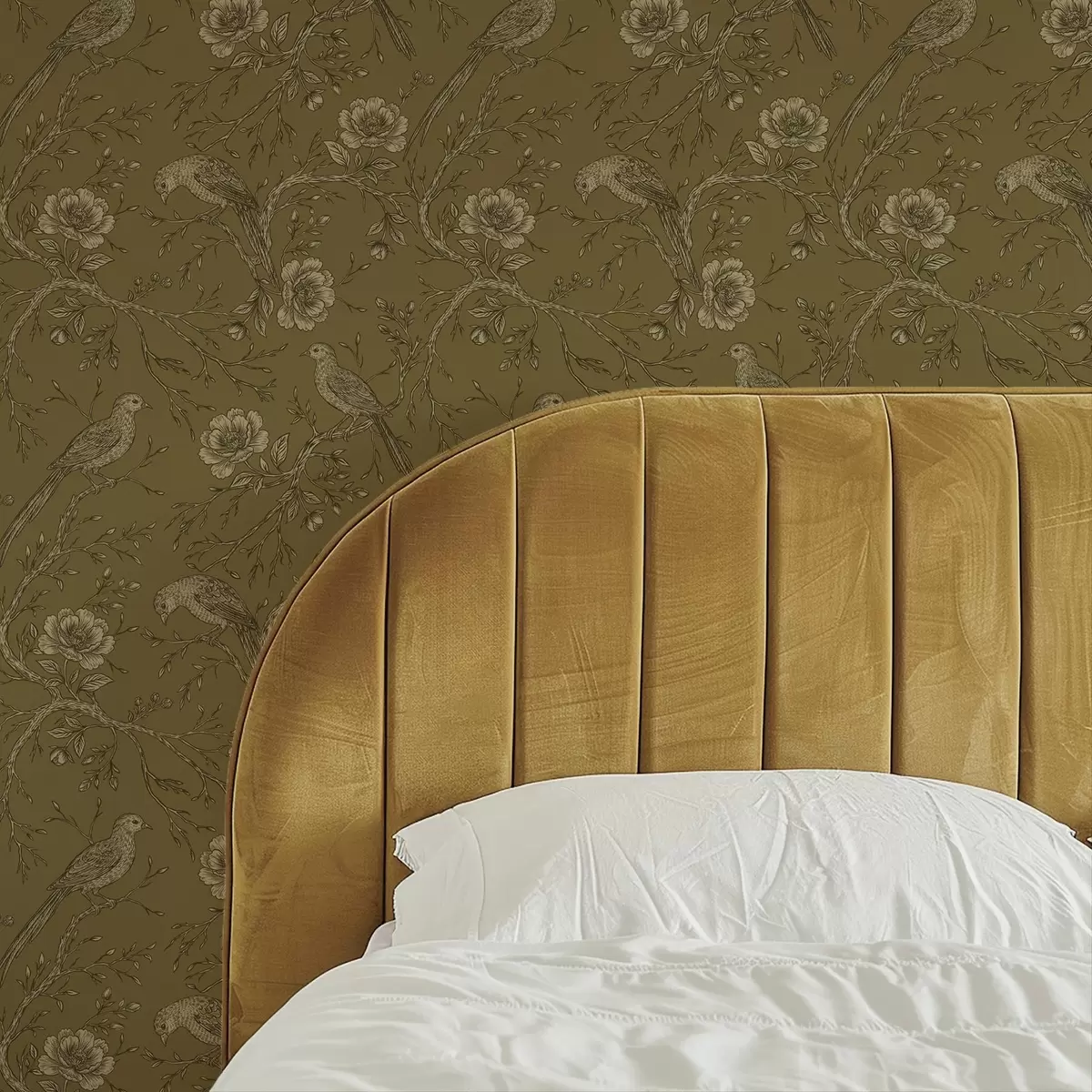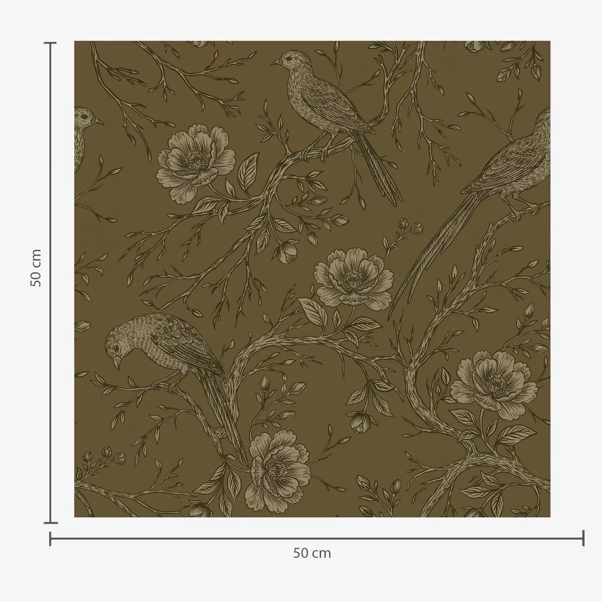 Шпалери Вінтажні птахи та квіти на теплому оливковому тлі Nr. a01022v1