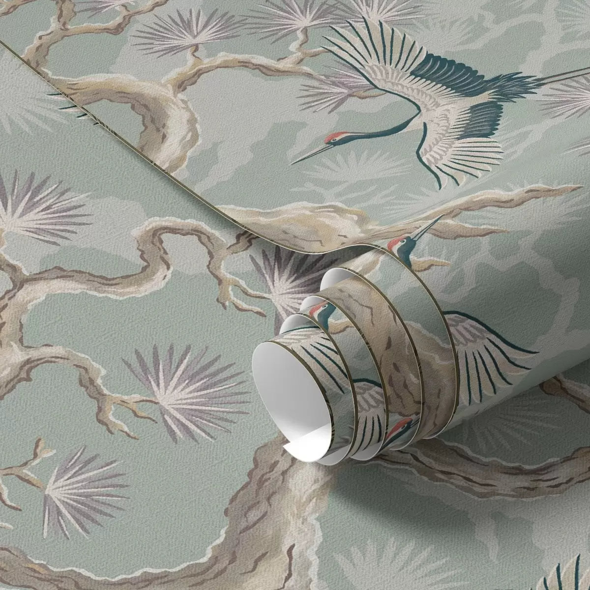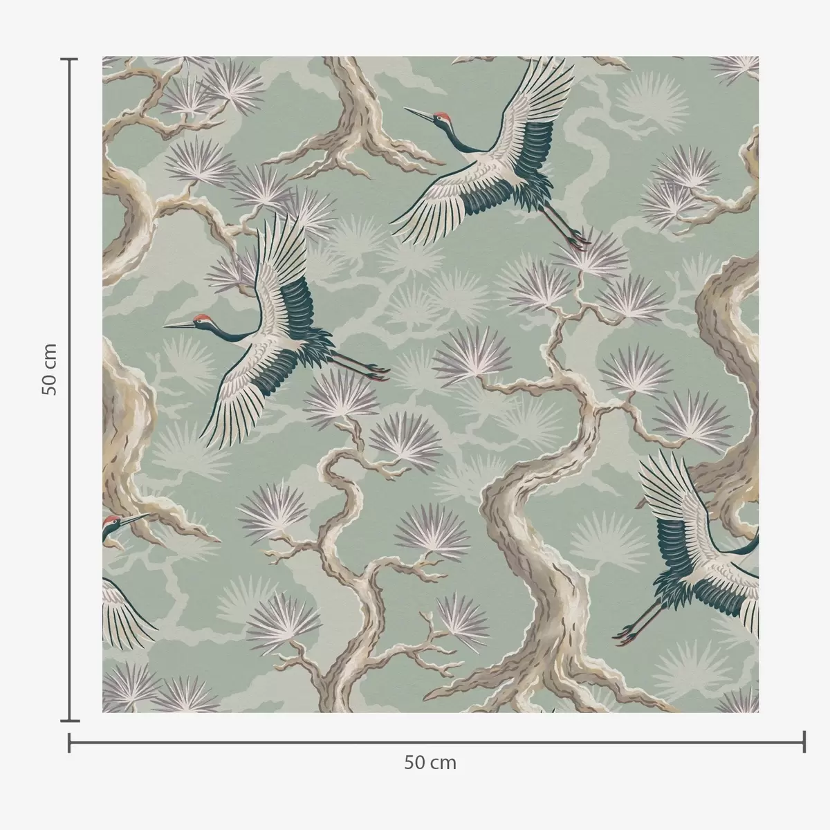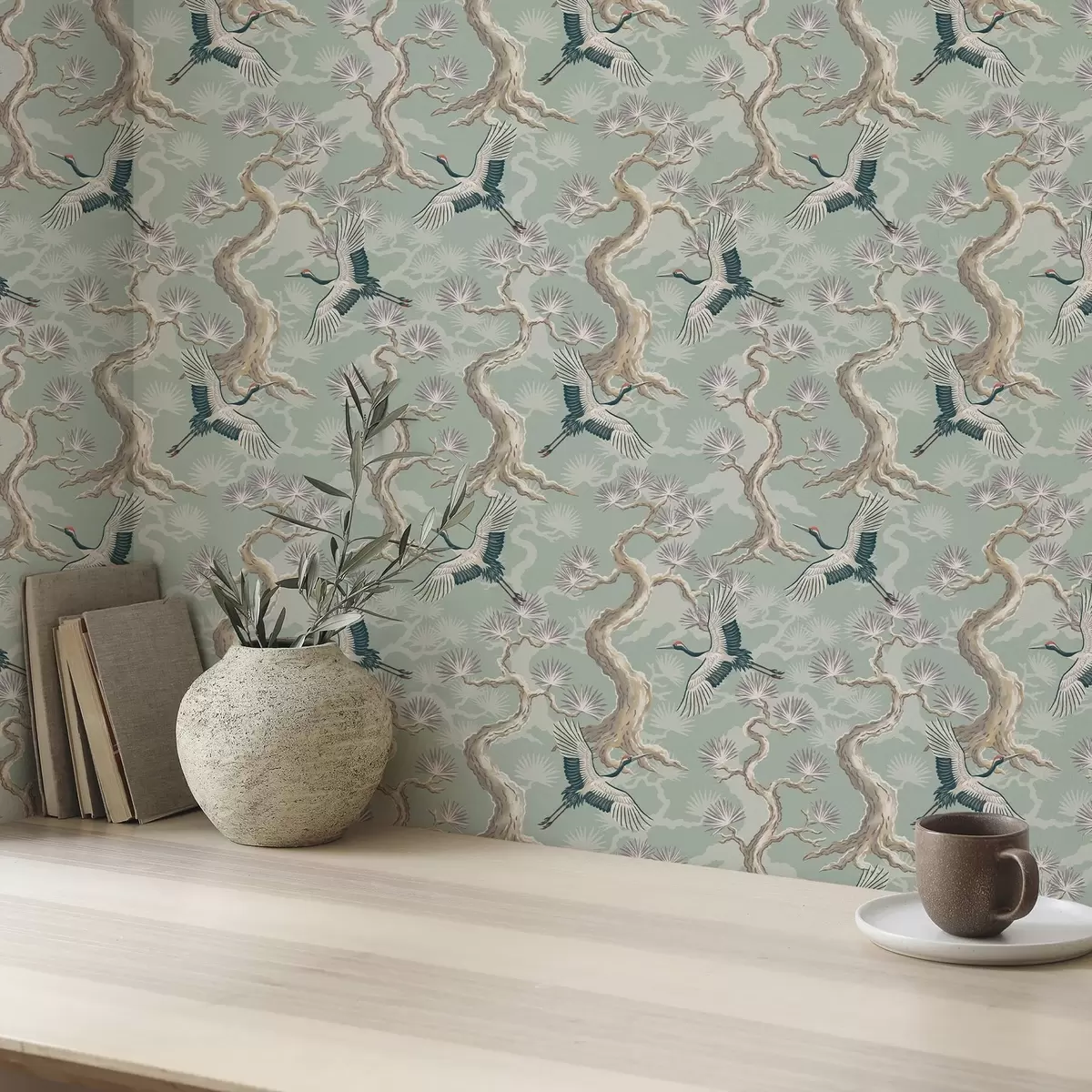 Шпалери Журавлі серед вигнутих гілок на м'якому фоні кольору шавлії Nr. a01023