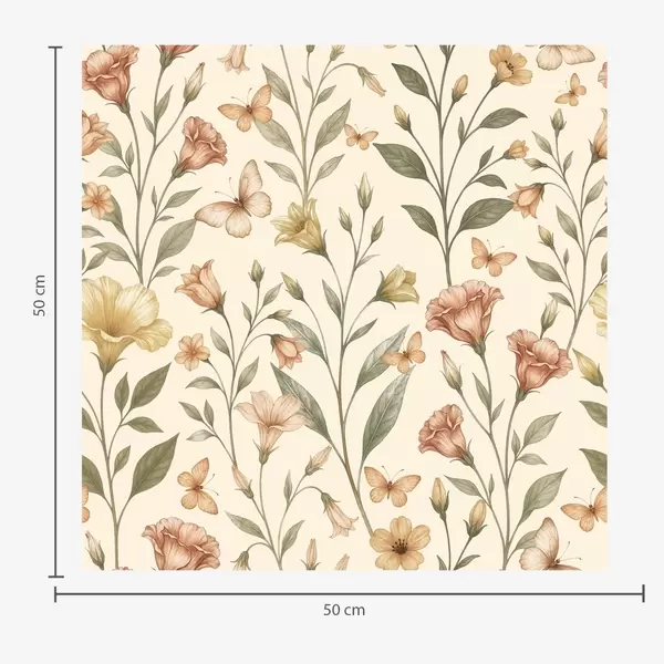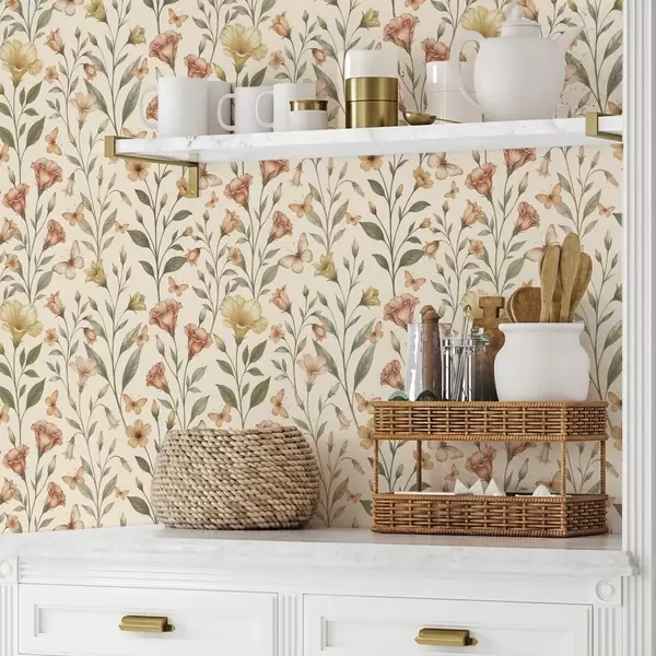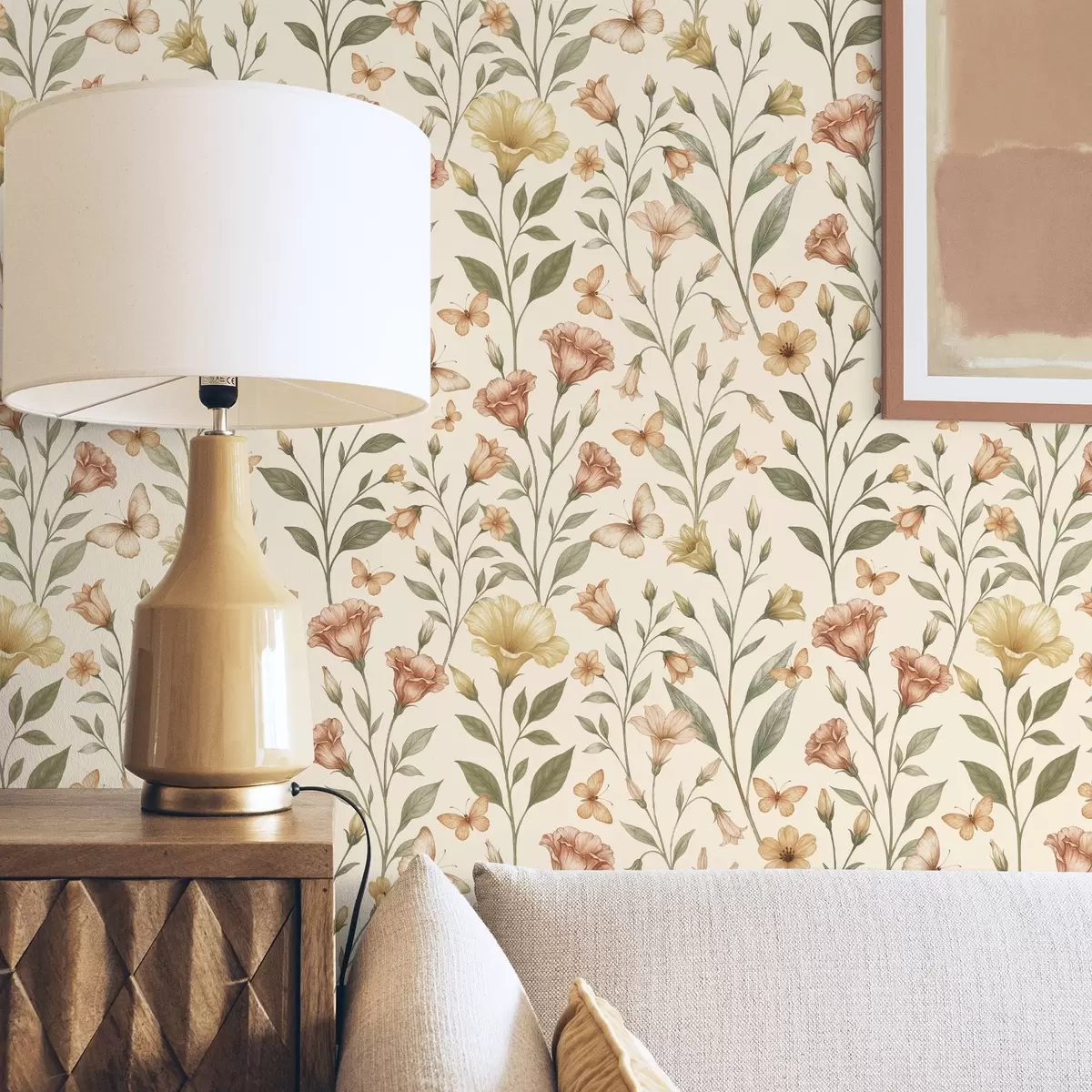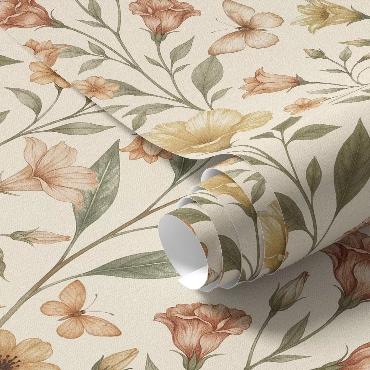 Шпалери Ніжні персикові квіти та метелики на теплому кремовому тлі Nr. a01026
