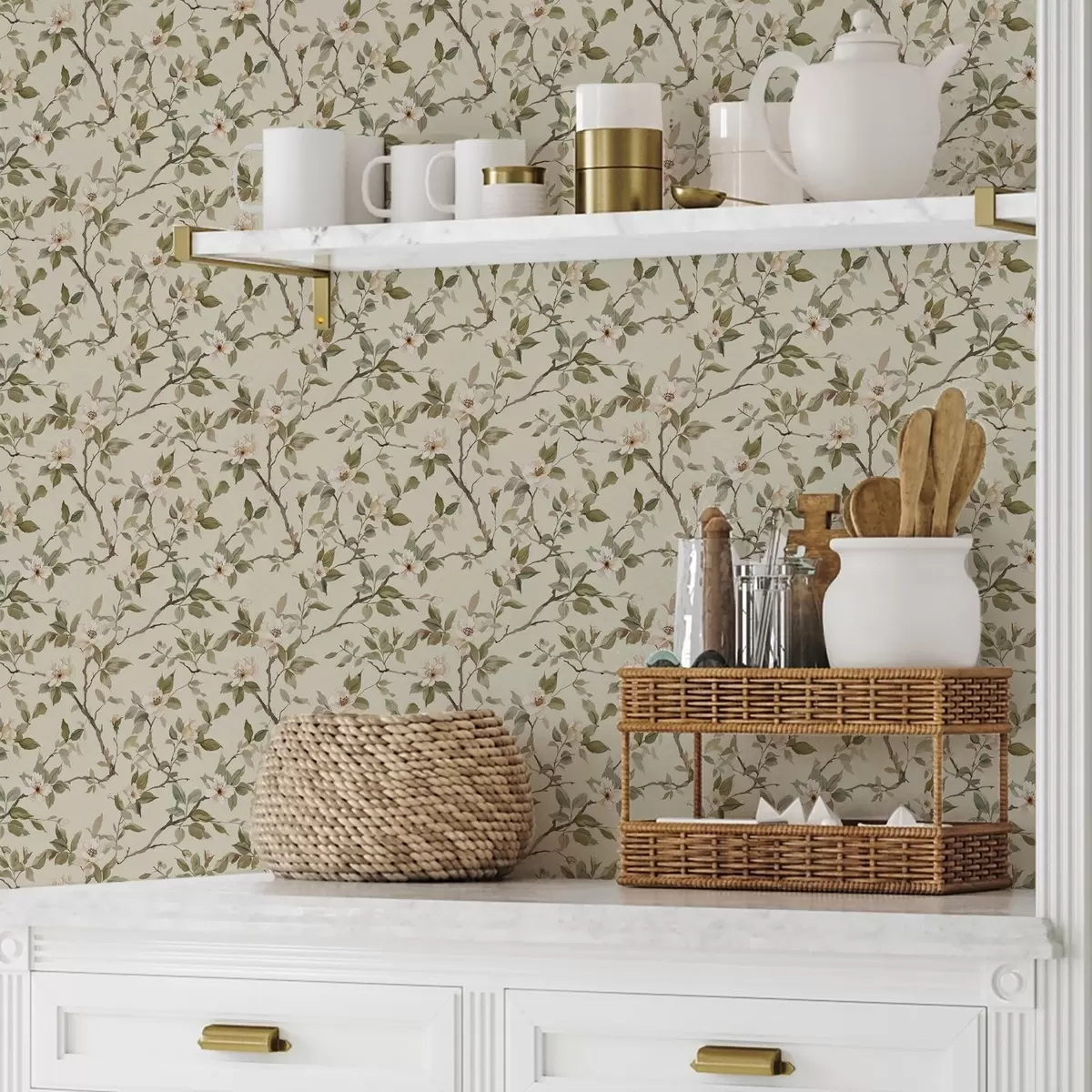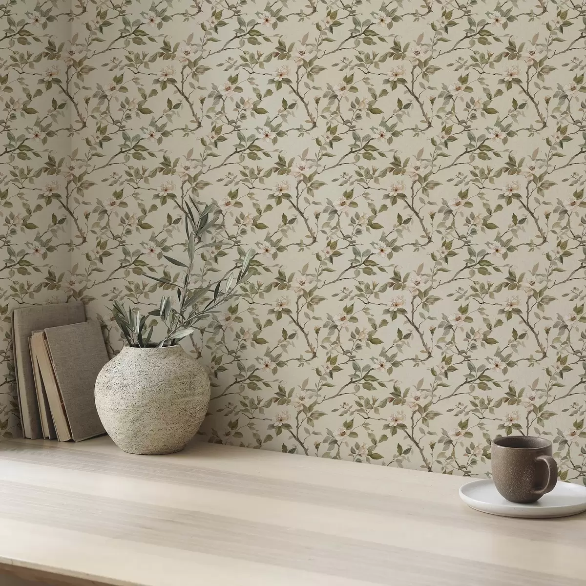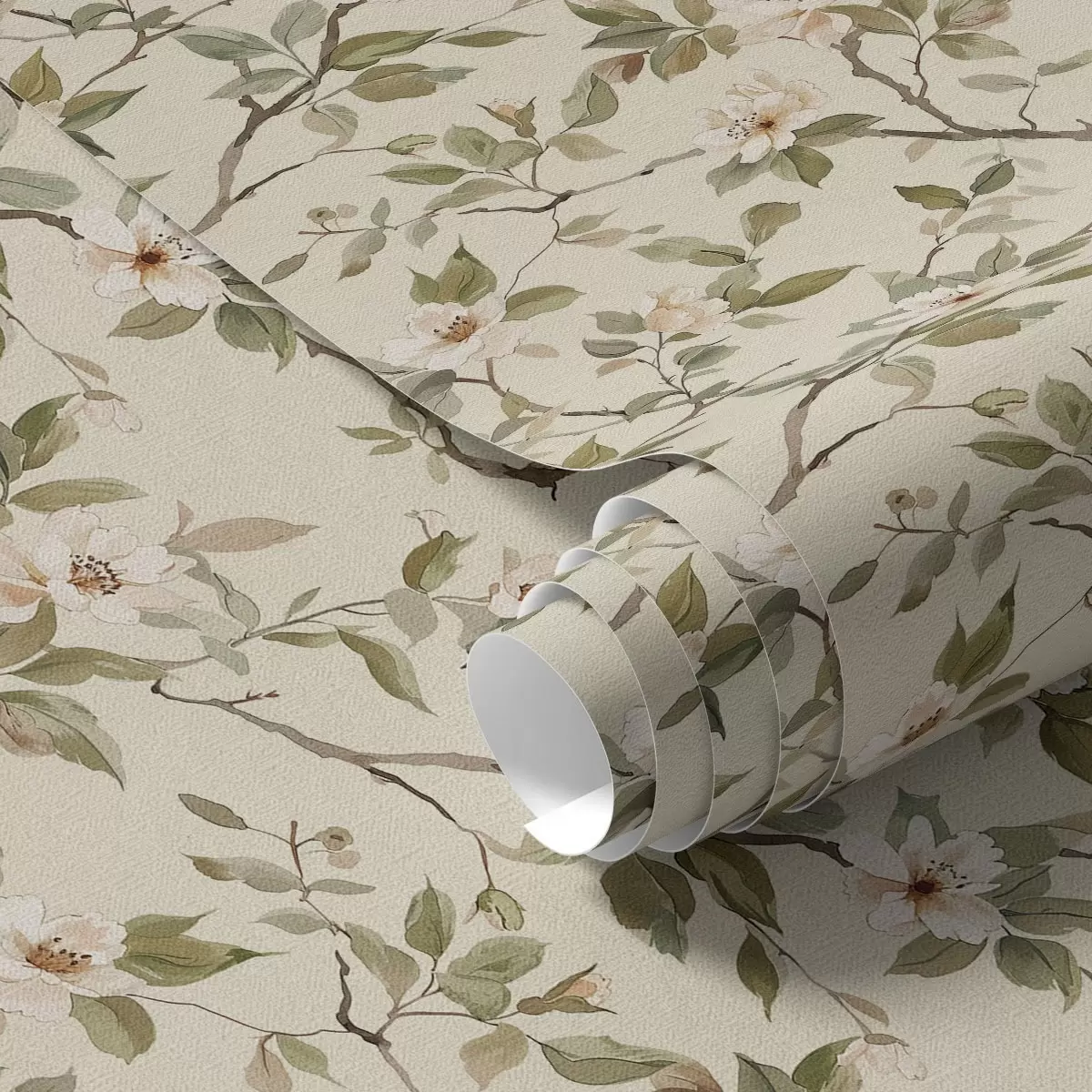 Шпалери Легкі гілки з крихітними кремовими квітами та зеленим листям Nr. a01028