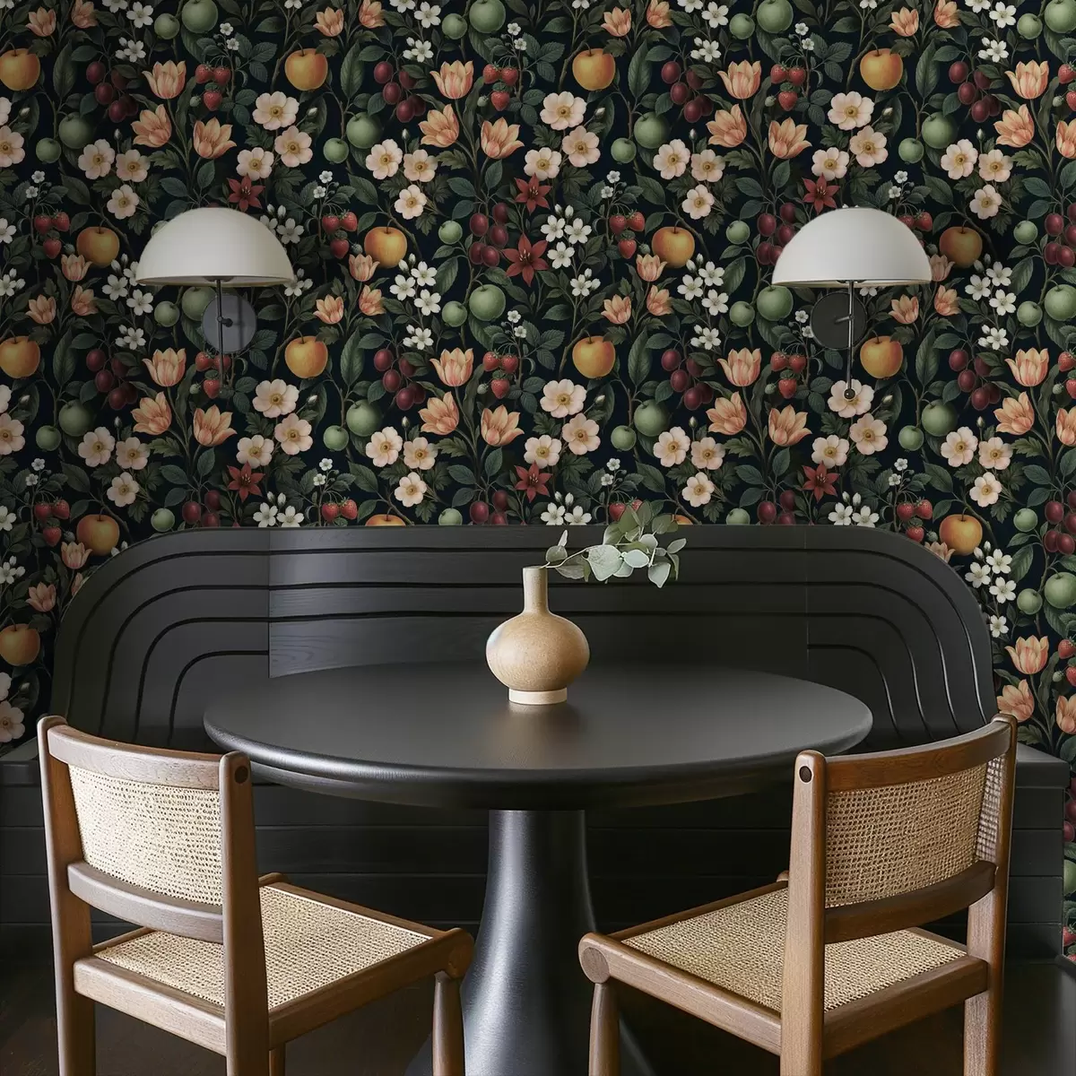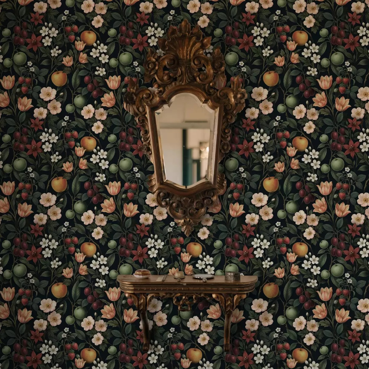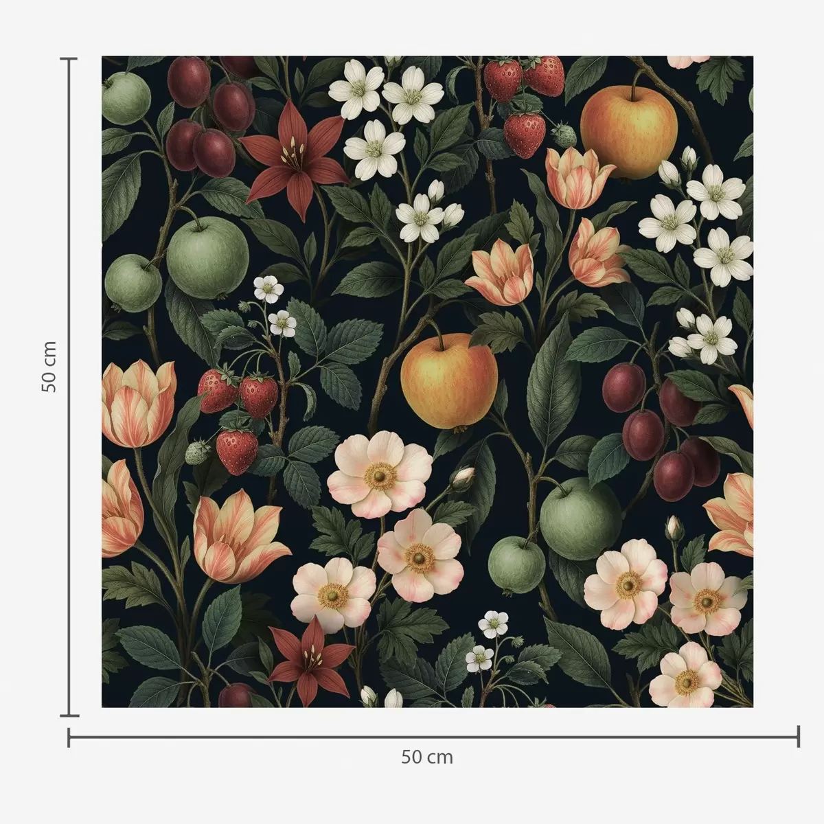 Шпалери Темний сад з квітами, стиглими яблуками та ягодами Nr. a01034