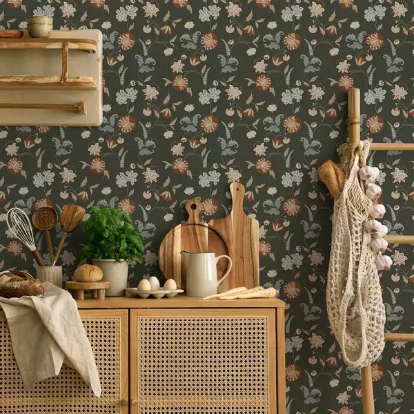 Шпалери Темно-зелений фон з декоративними квітами та листям Nr. a01086