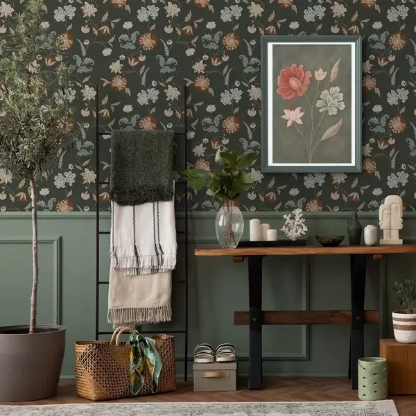 Шпалери Темно-зелений фон з декоративними квітами та листям Nr. a01086