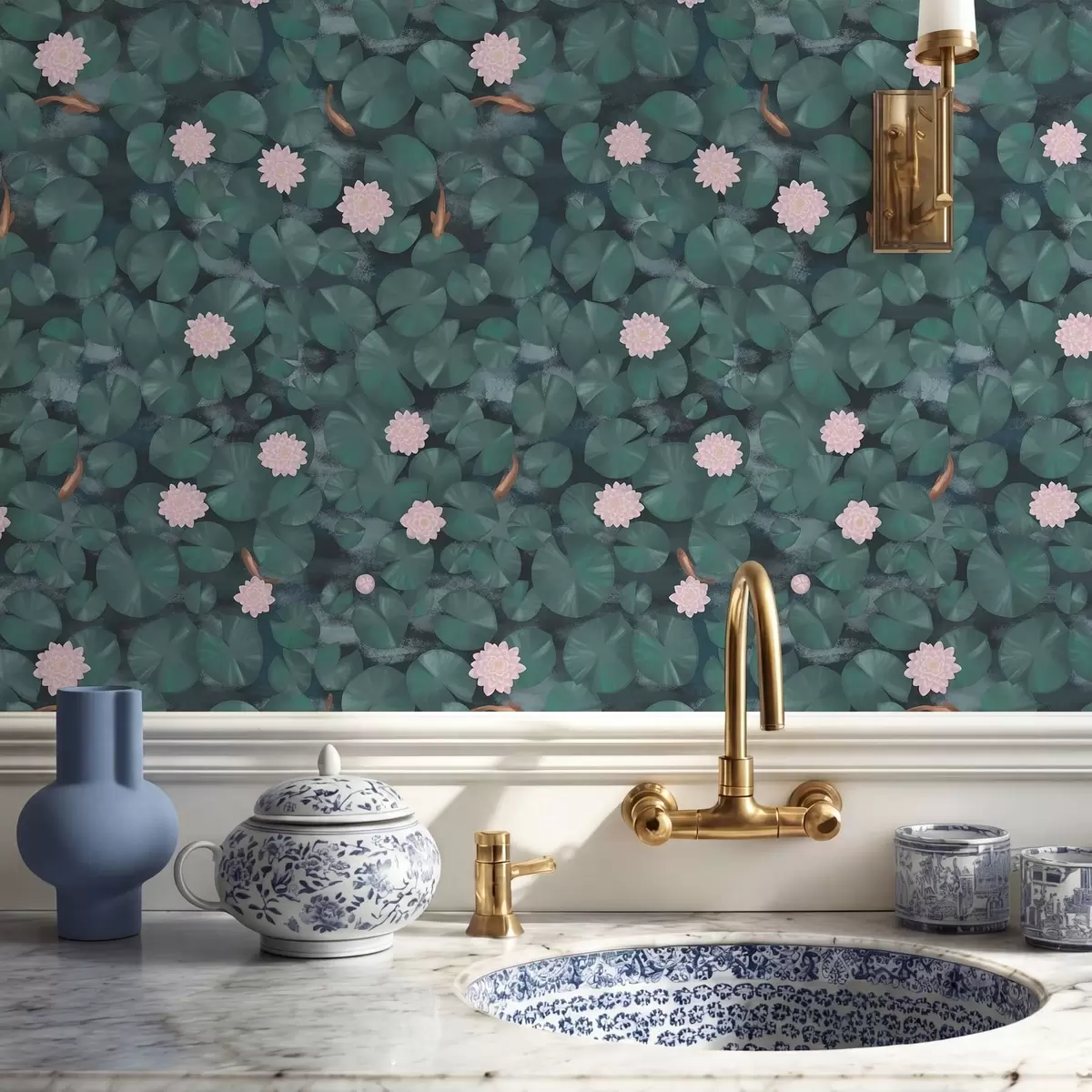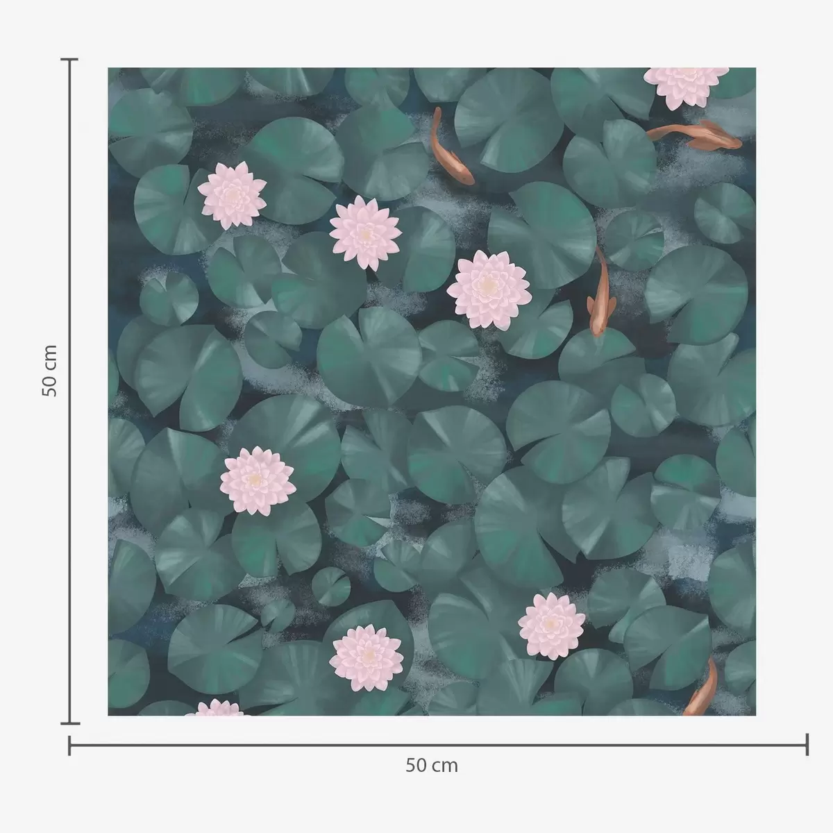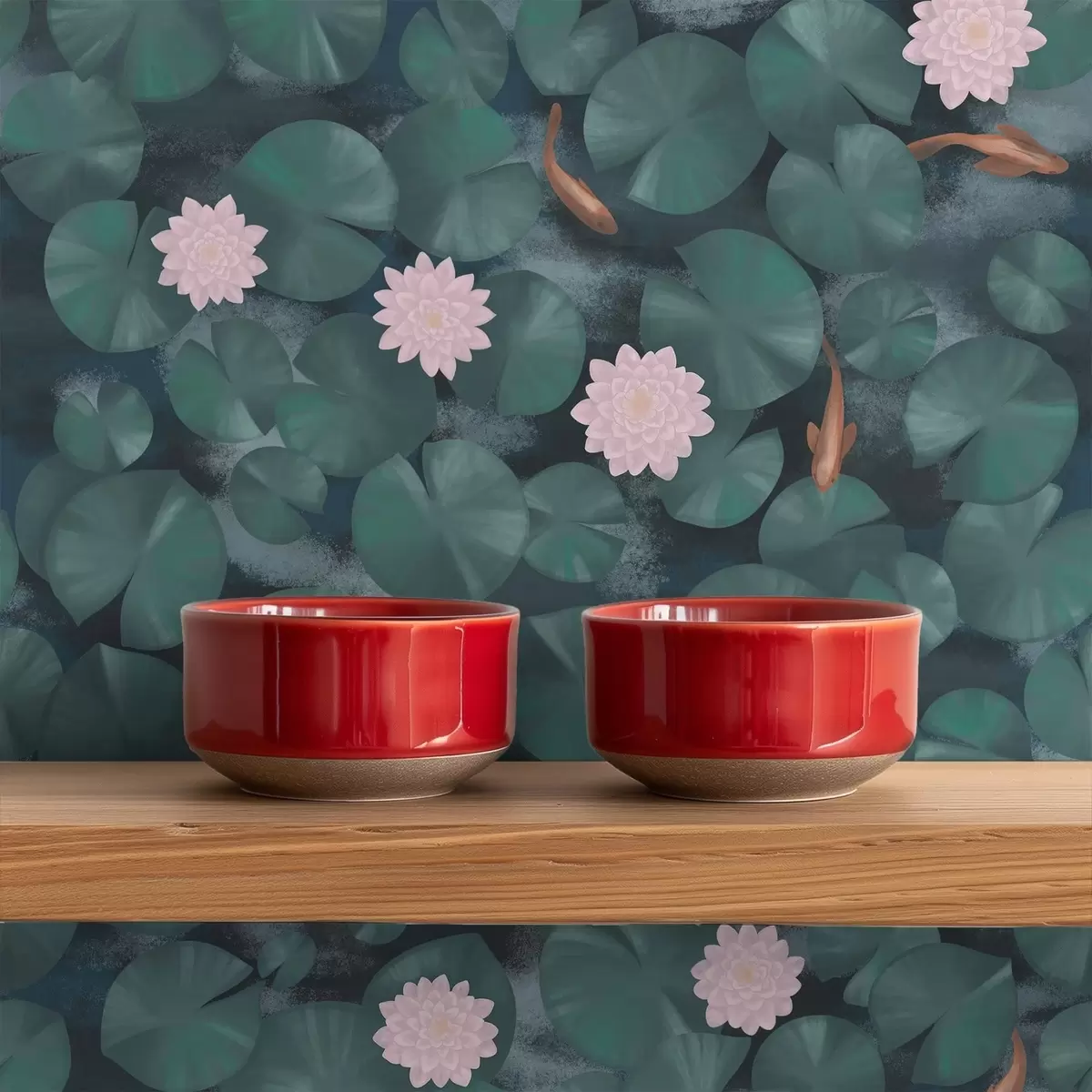 Шпалери Водяні лілії з квітами та рибками на темному тлі Nr. a01177