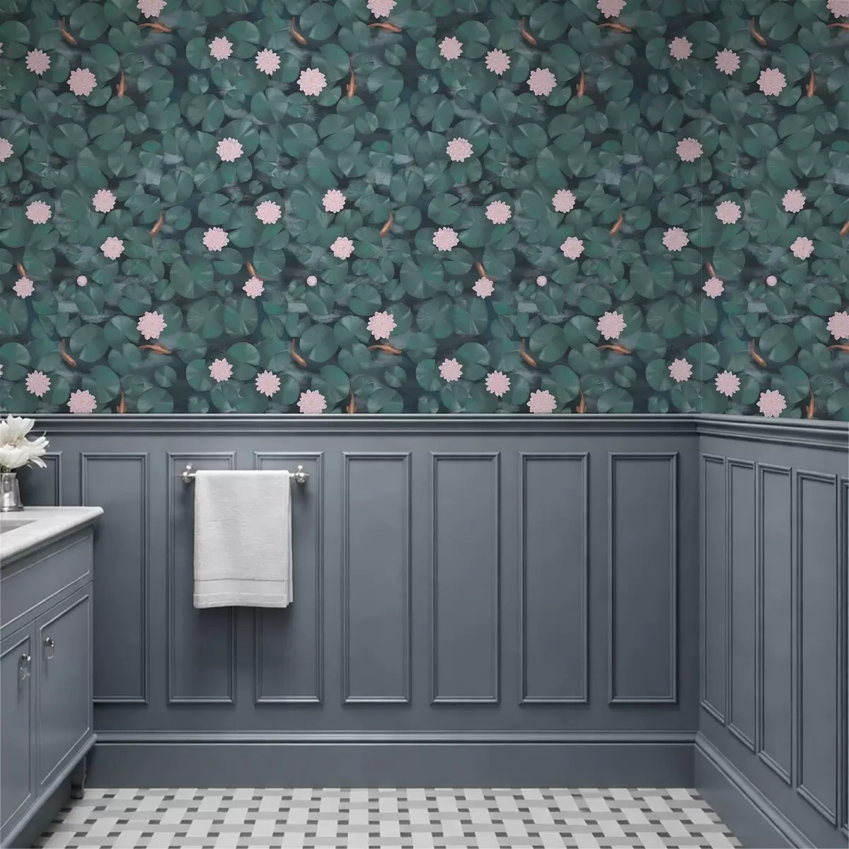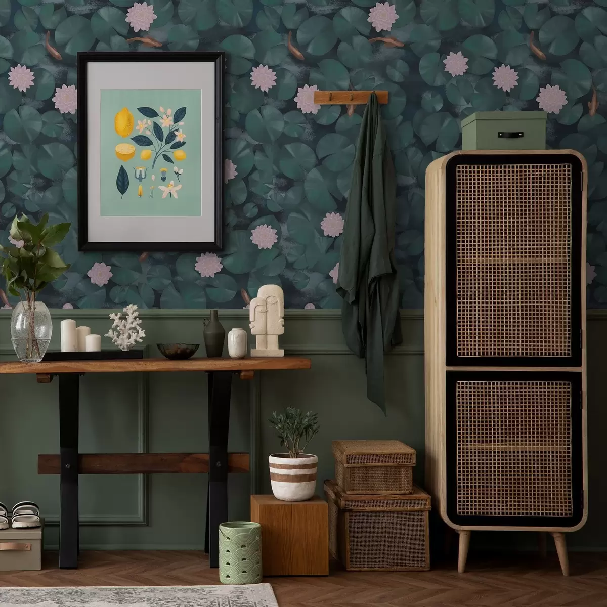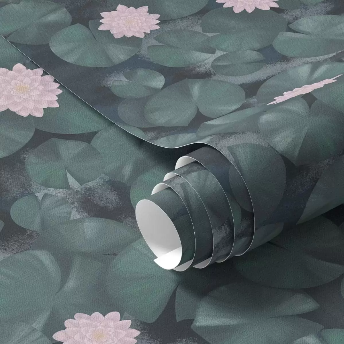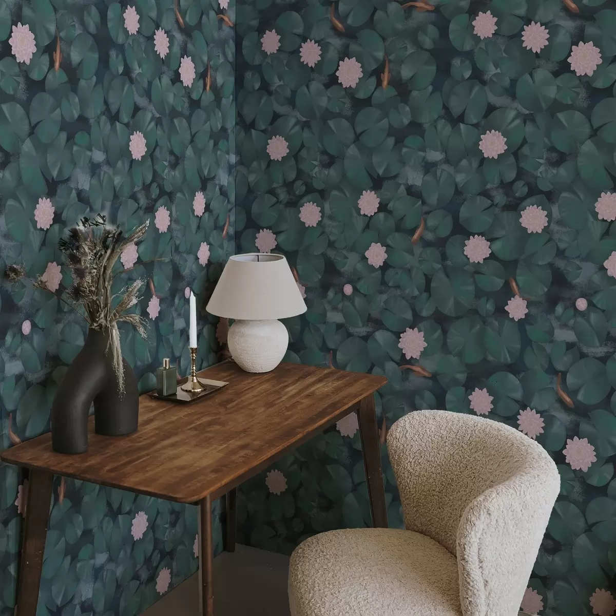 Шпалери Водяні лілії з квітами та рибками на темному тлі Nr. a01177