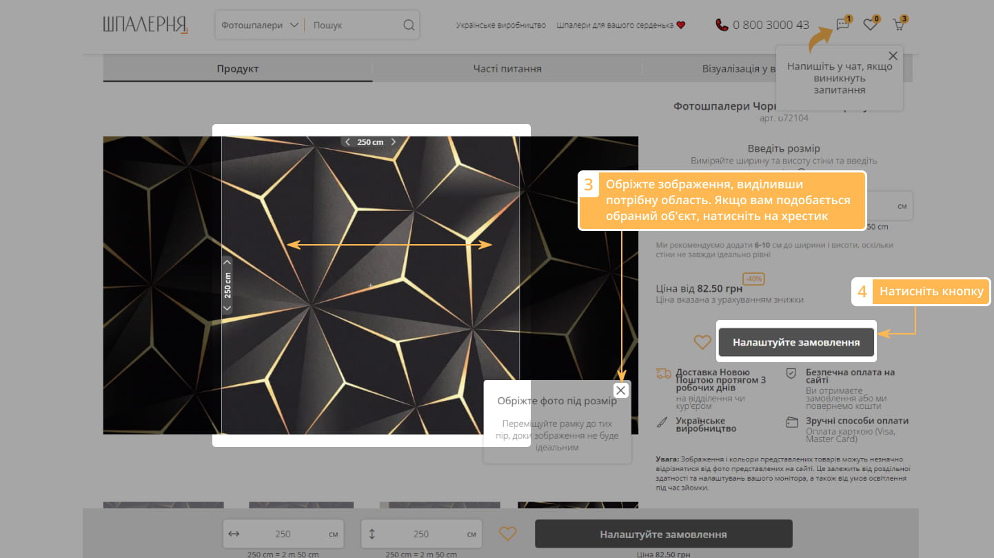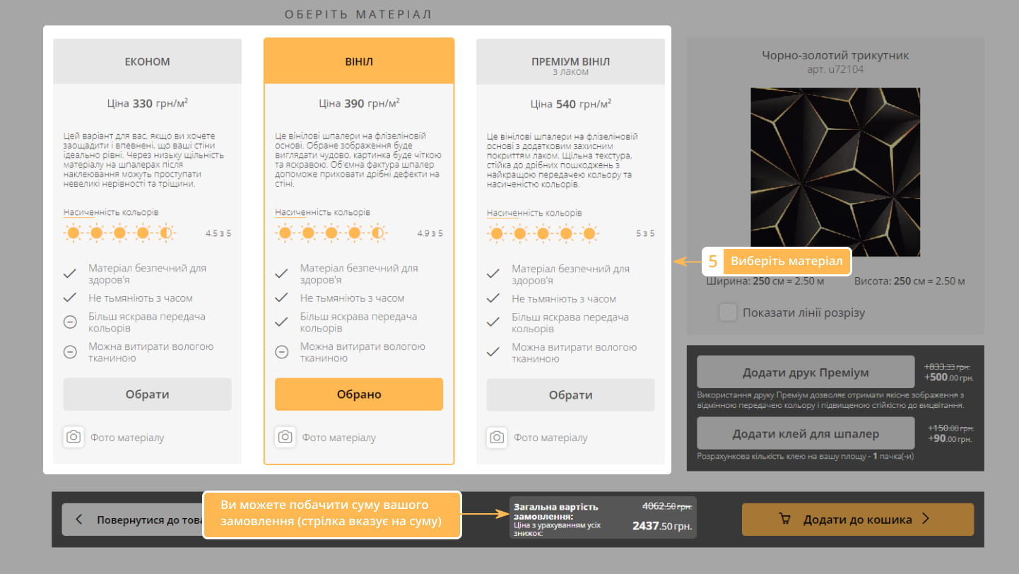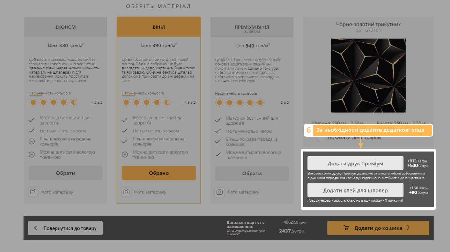 5. Виберіть матеріал і за необхідності додайте додаткові опції.